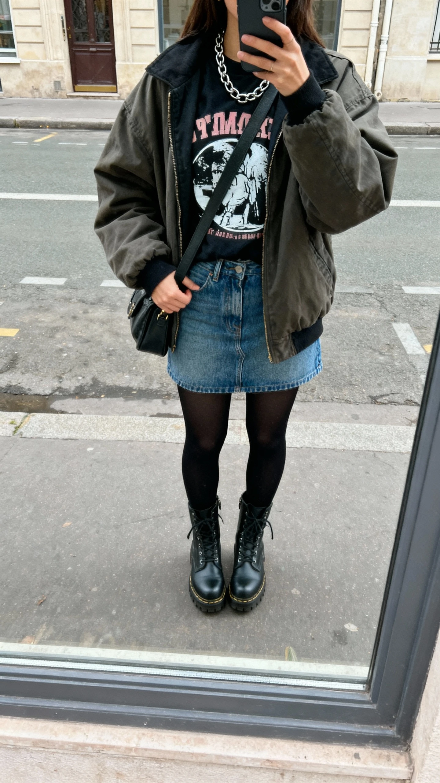 Lean into a little edge without sacrificing warmth. A denim skirt with black tights, a band tee or chunky knit, and combat boots feels cool, comfortable, and totally wearable. It’s the grown-up version of 90s grunge—clean, modern, and easy to style.