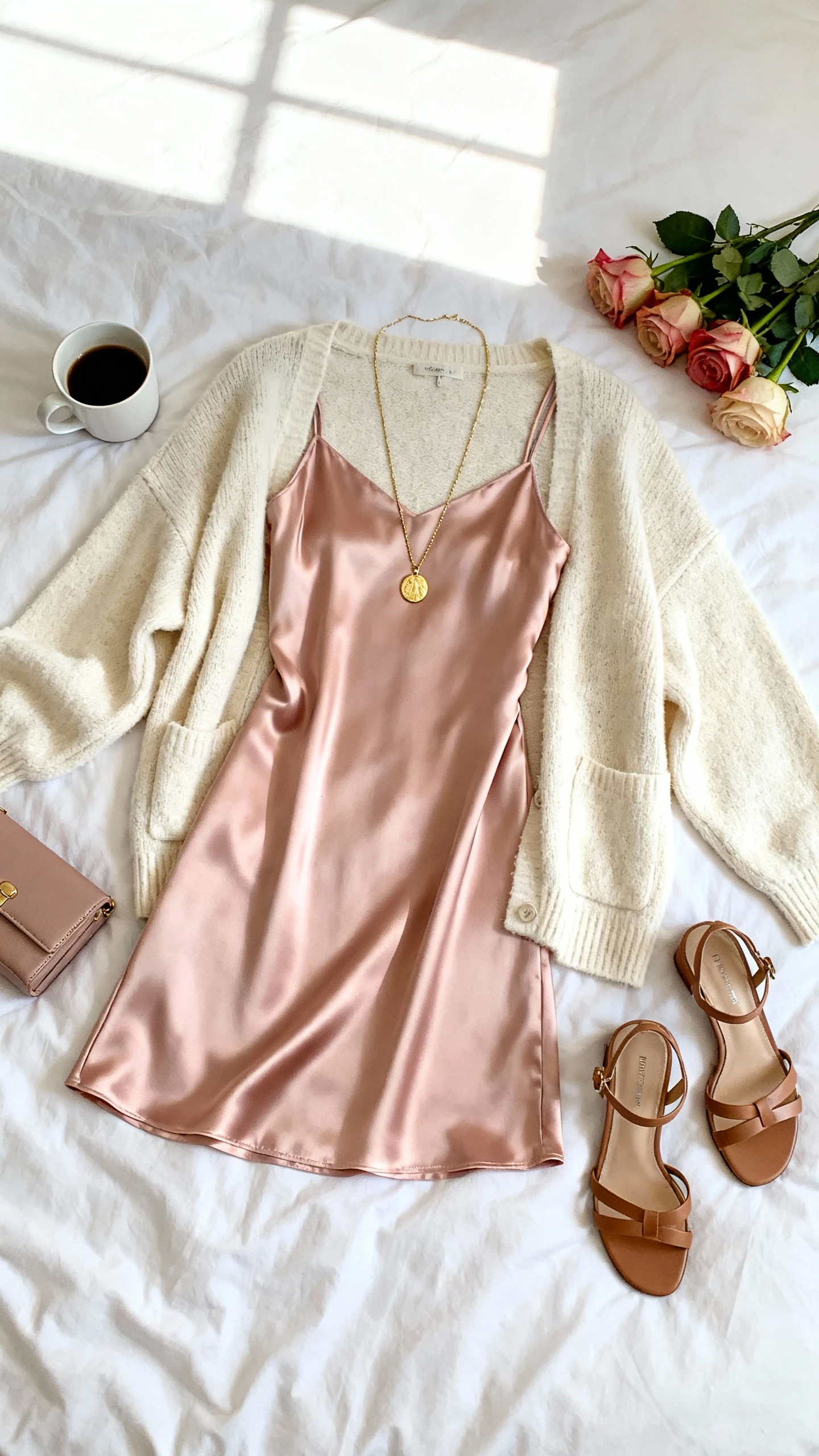 1. Soft-Glam Satin Slip Magic With A Cozy Oversized Cardigan