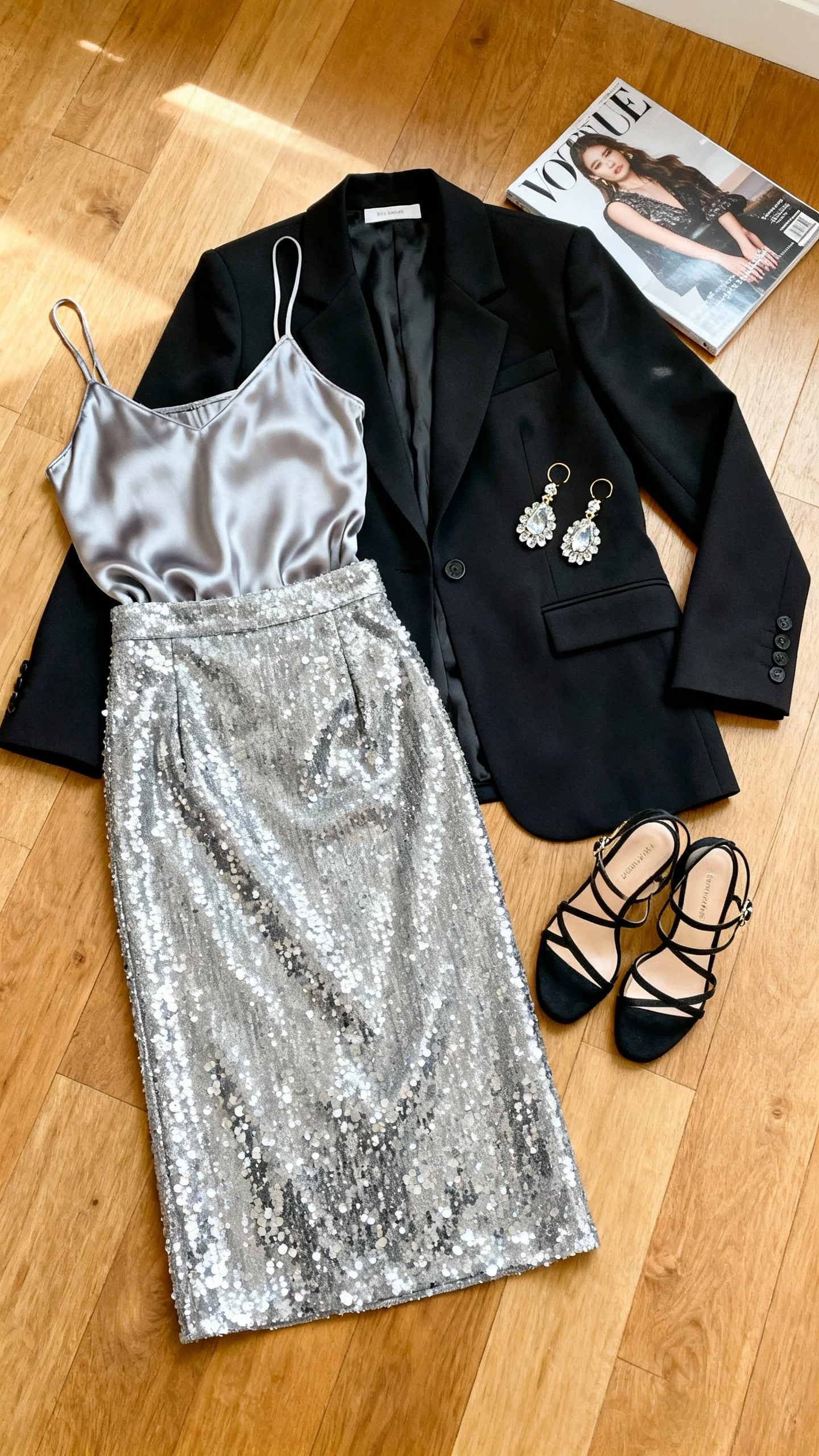 Great for cocktails, a show, or a fancy dessert spot. If you want more edge, swap the blazer for a cropped leather jacket. Prefer subtle sparkle? Try a beaded skirt instead of full sequins.