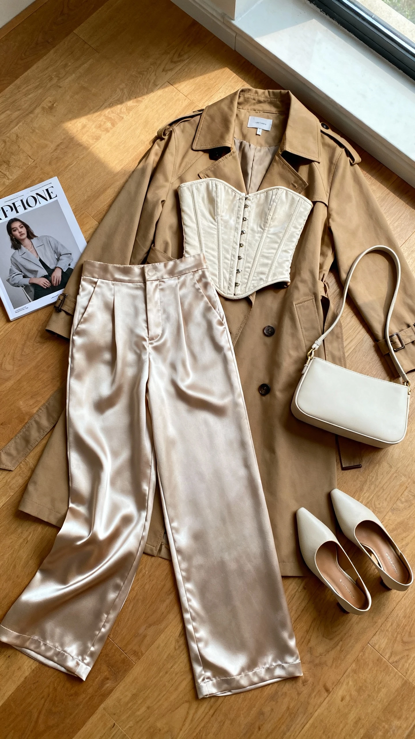7. Satin Wide-Leg Pants With A Corset Top And Trench