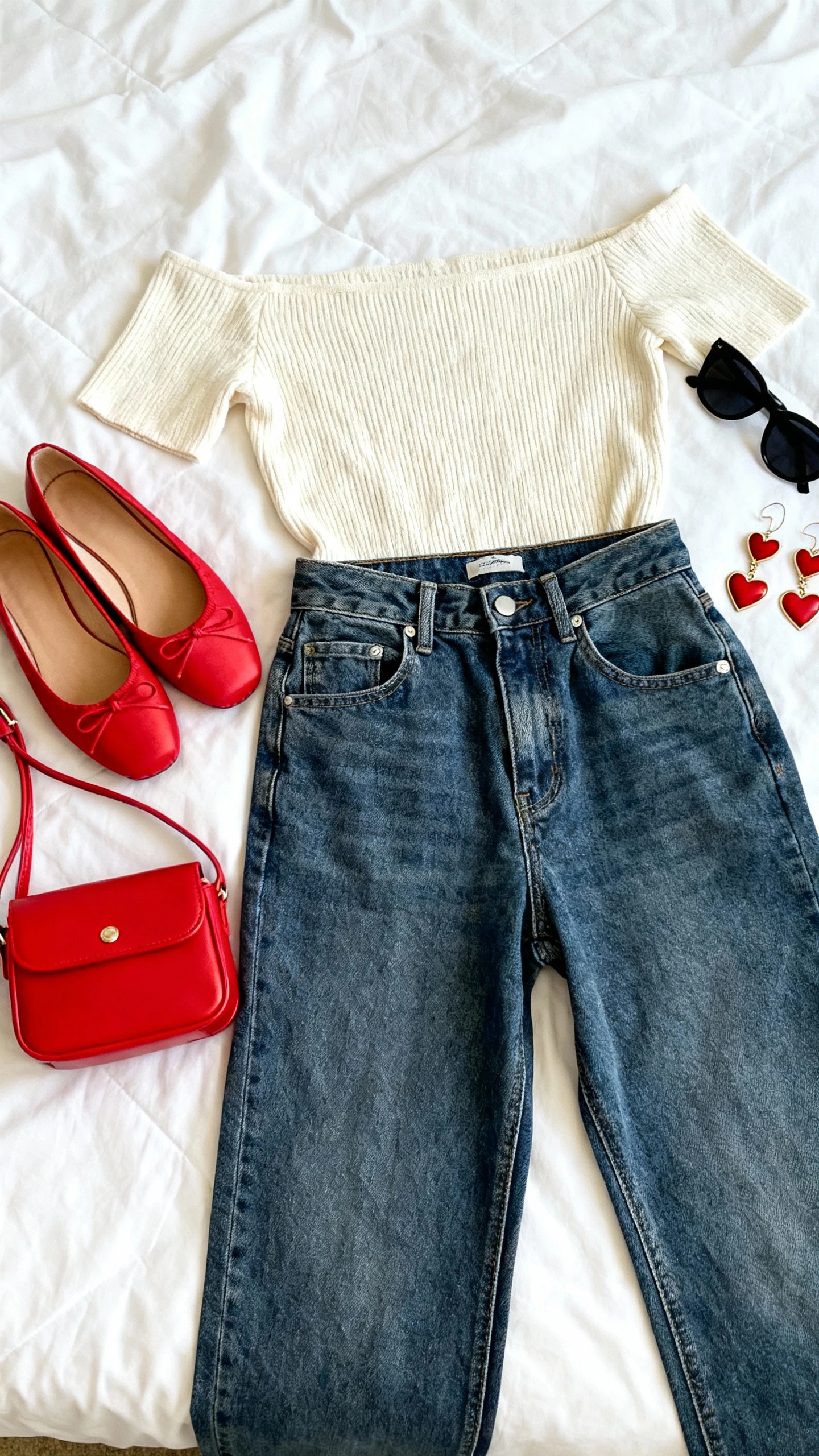 4. Casual-Cute Denim And Off-Shoulder Knit With Red Accents