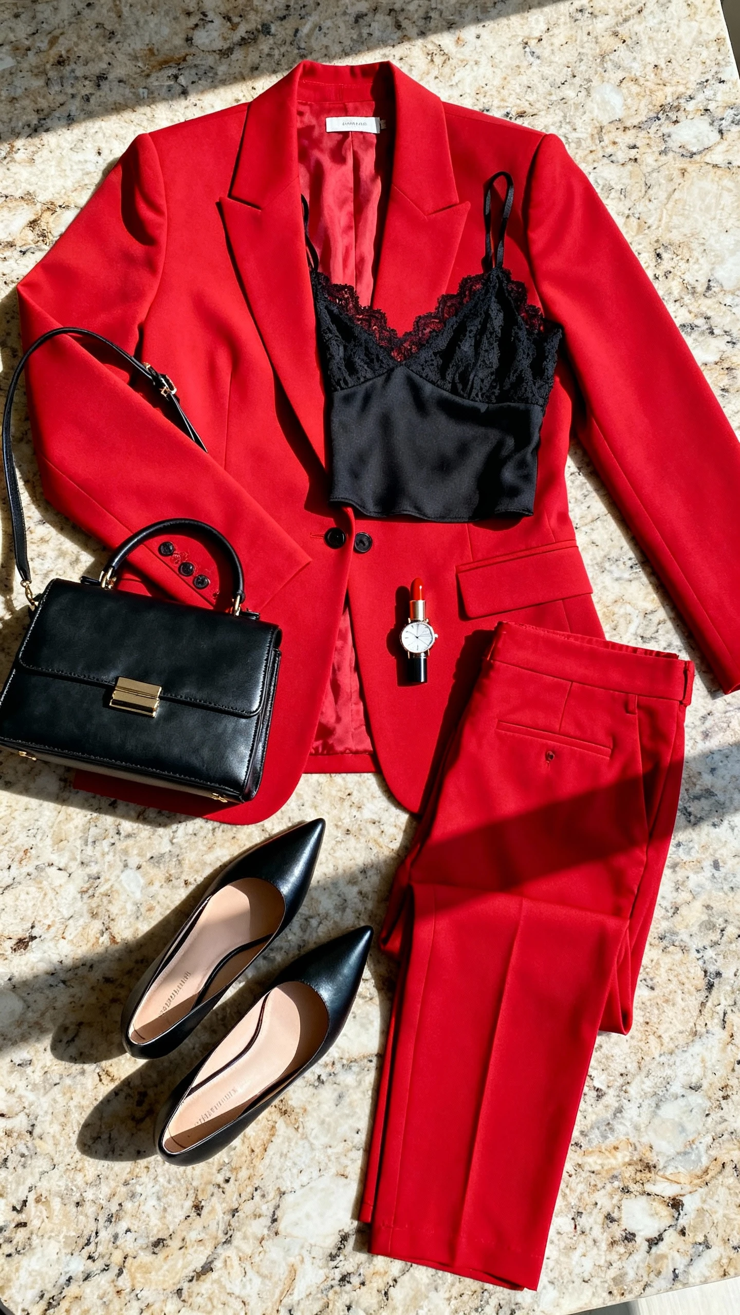 If you love a boss moment, a tailored suit in a romantic red tone is iconic. It’s striking, modern, and works for dinner, a gallery date, or even a Valentine’s cocktail party. The lace adds softness without losing the sharp vibe.