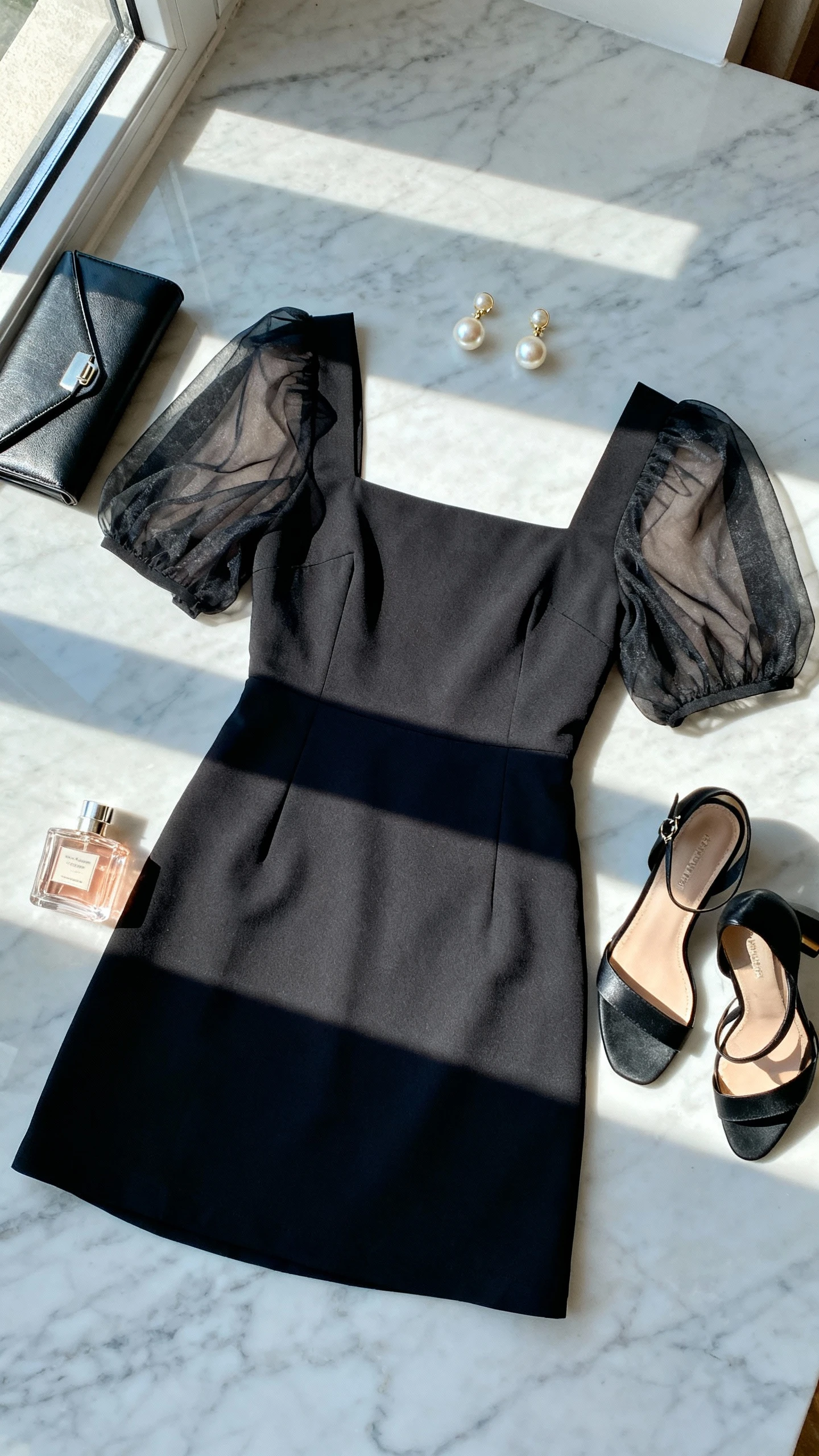 - Black mini or midi dress with a square neckline and sheer sleeves