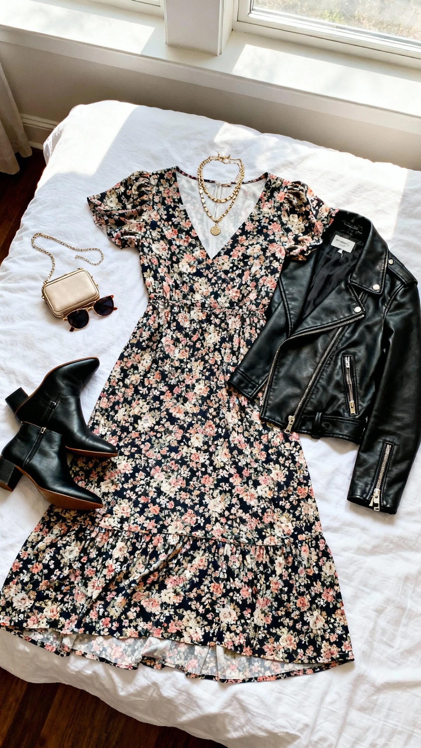 Floral dresses aren’t just for spring—choose deeper tones and add leather for contrast. It’s romantic with a little bite, and it photographs beautifully. You’ll look soft, strong, and totally in control.