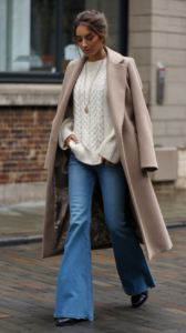 • Layer thoughtfully: Blazers, coats, and chunky knits turn casual flares into chic ensembles.