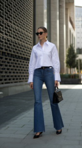 There’s nothing like a crisp white blouse tucked into dark wash flared jeans. Effortless, chic, and office-to-dinner ready.