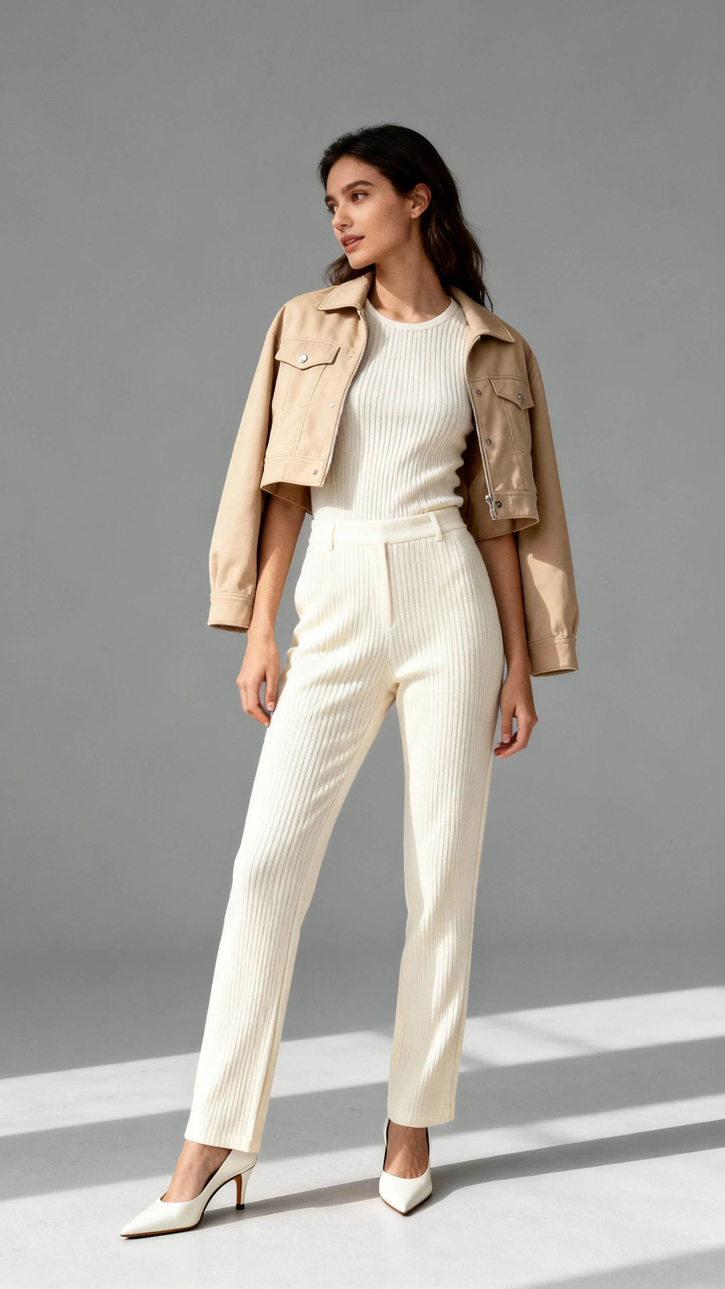 - Cropped beige jacket (suede, denim, or tweed)