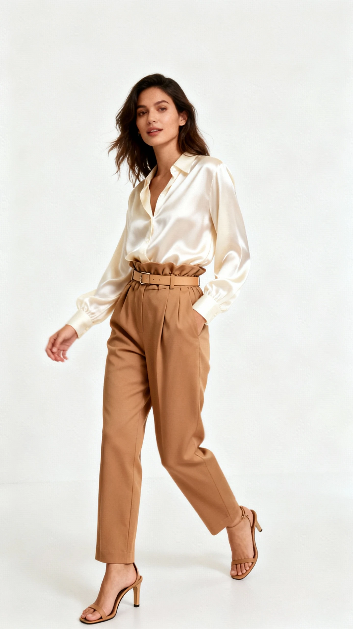 Paperbag pants in a neutral tone with a fluid silk blouse are peak soft power: polished, feminine, and comfortable. The cinched waist defines your shape while the silk drapes like a dream. It’s the outfit that always looks intentional.