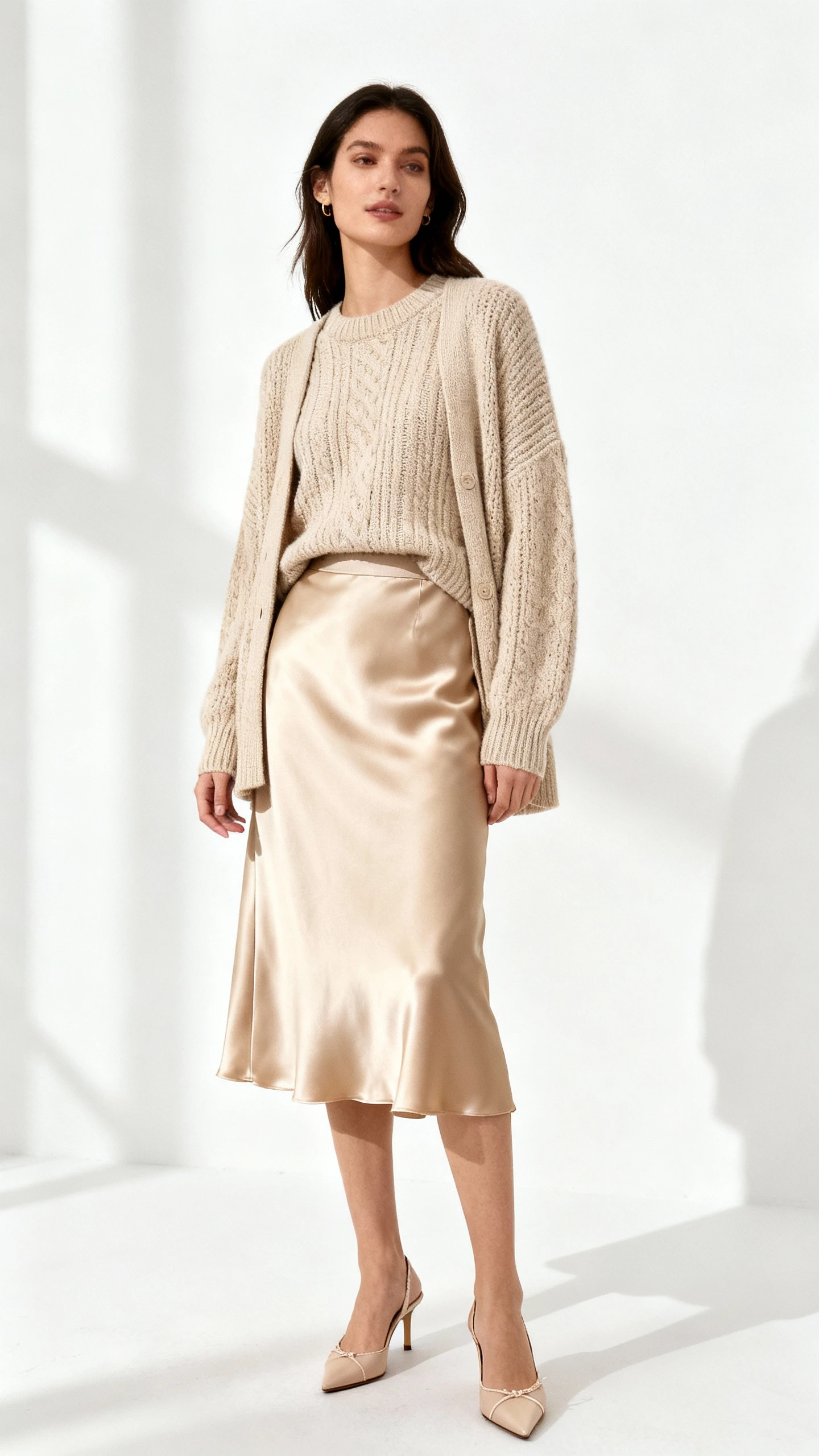 Balance is everything. Mix matte and sheen—like knit with silk or suede with satin—to avoid looking flat. When in doubt, add one darker tan piece to anchor the look, like a belt or shoe.