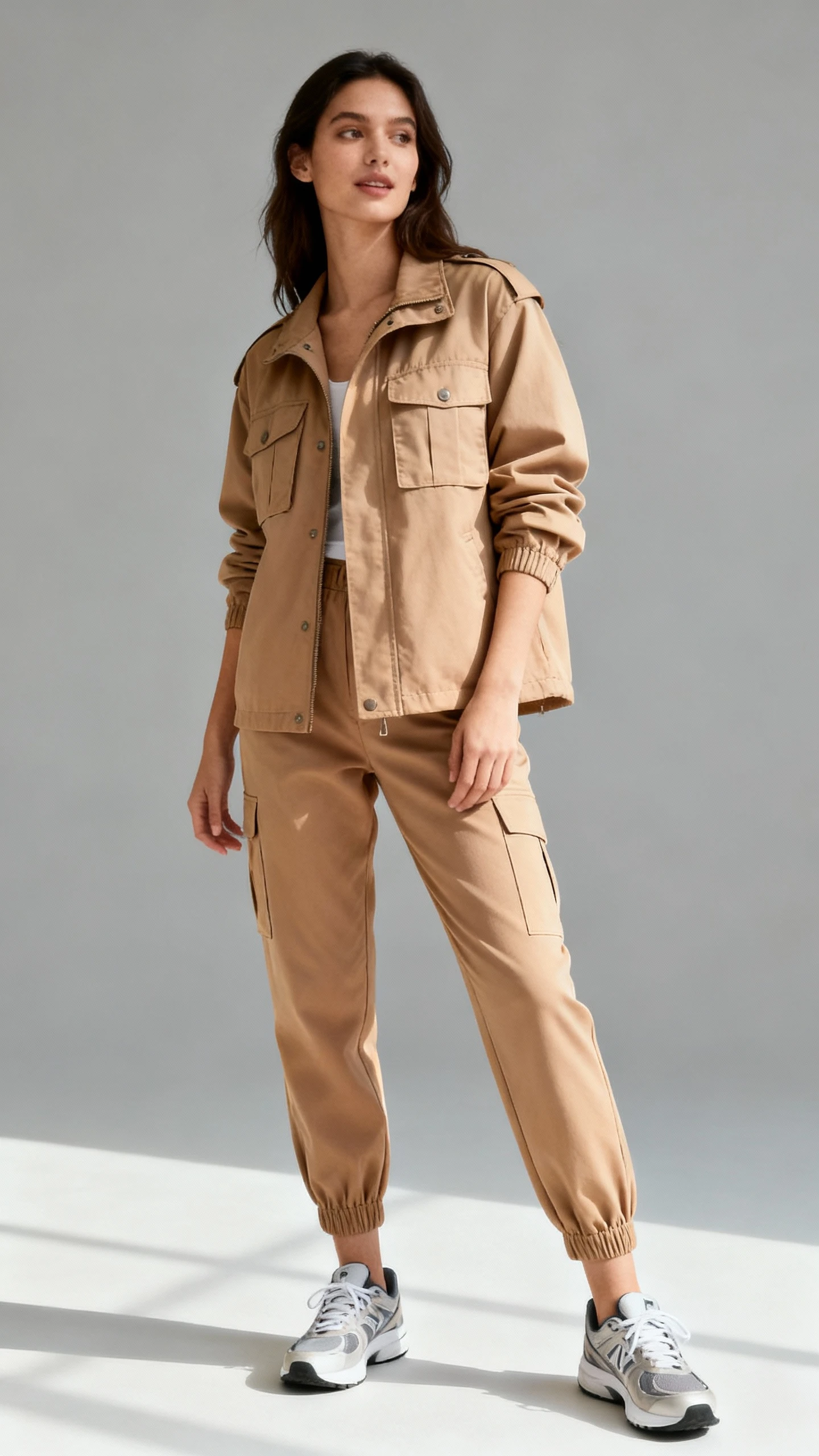Think cargo, but refined. A utility-style jacket and straight trousers in matching beige deliver comfort and structure without effort. It’s the kind of outfit that looks great with a messy bun and a coffee in hand.