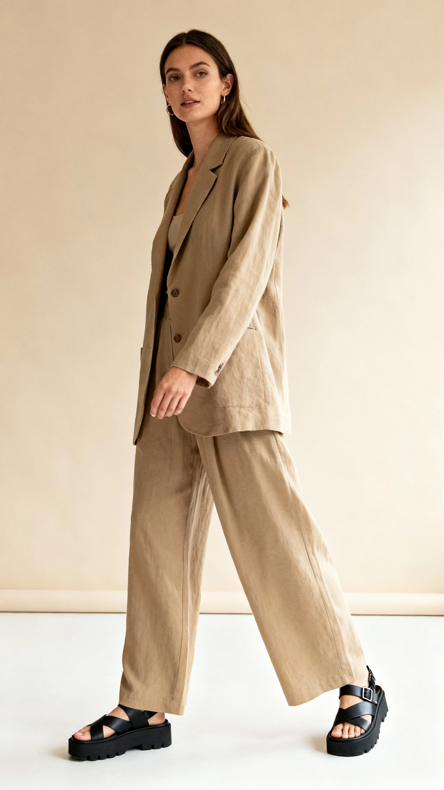 Suiting doesn’t have to be stiff. A relaxed camel suit with a simple top and chunky sandals reads cool and contemporary. You get structure without the boardroom energy—perfect for early spring when you’re ready to lighten up.