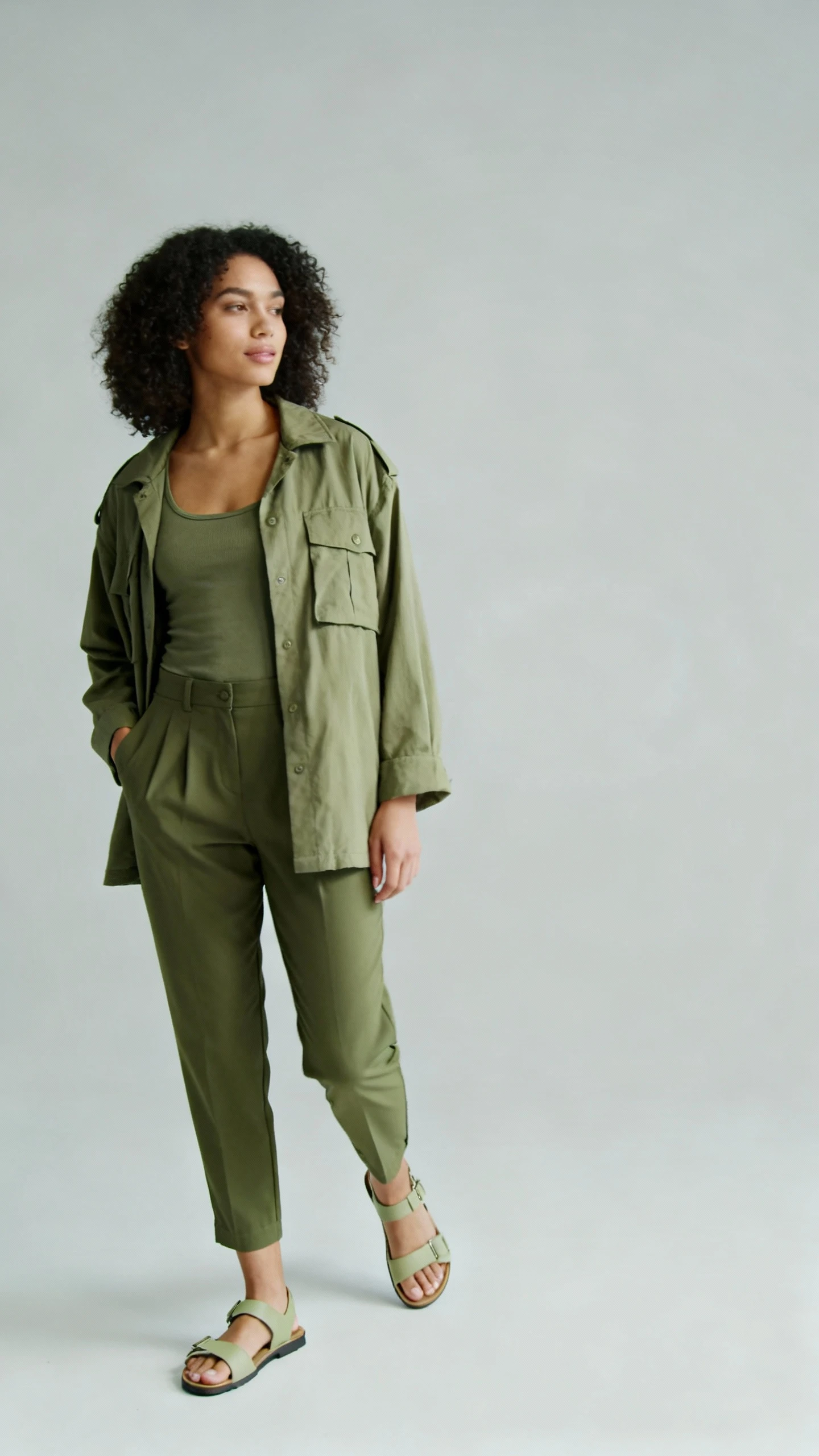 - Play with shades of the same color to keep it dimensional (light olive tank, deeper olive pants).