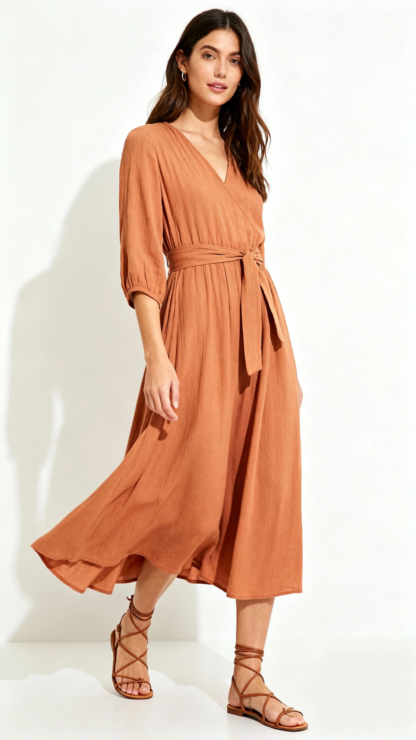 - Sleeveless or short-sleeve maxi dress in sand, olive, terracotta, or cream