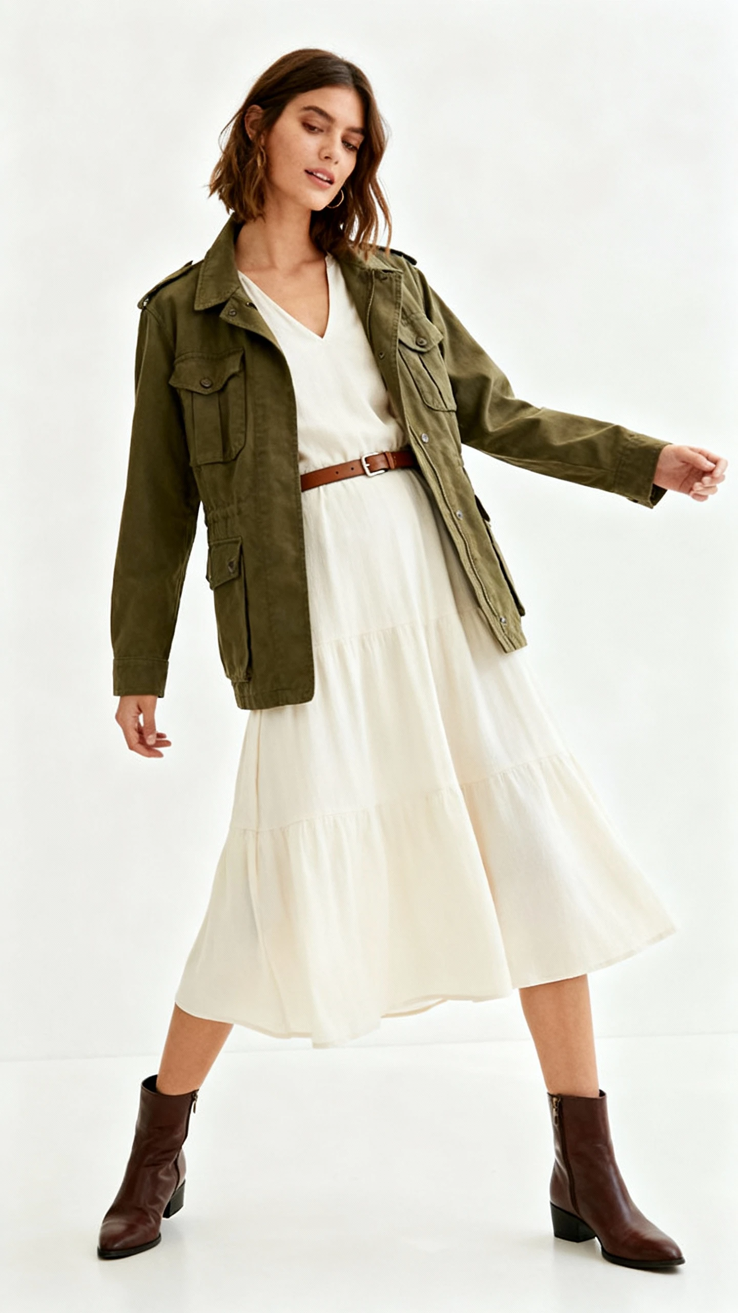A structured field jacket over a lightweight midi dress is the ultimate yin-yang: rugged and refined. The contrast adds depth and looks intentional—like you planned it weeks ago. It’s a go-to for chilly mornings and breezy nights.