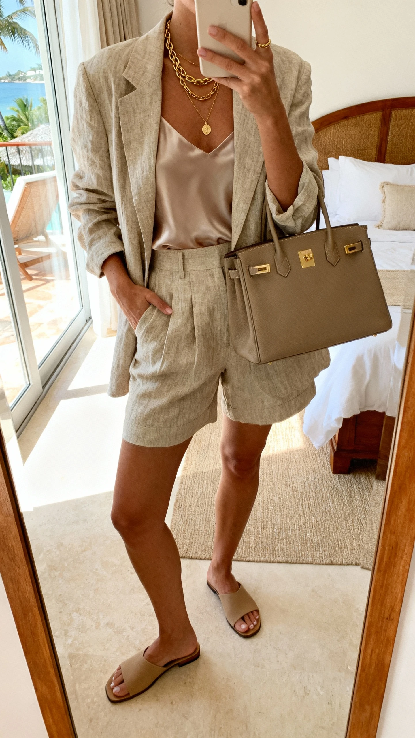 - Matching linen shorts (high-rise, tailored)