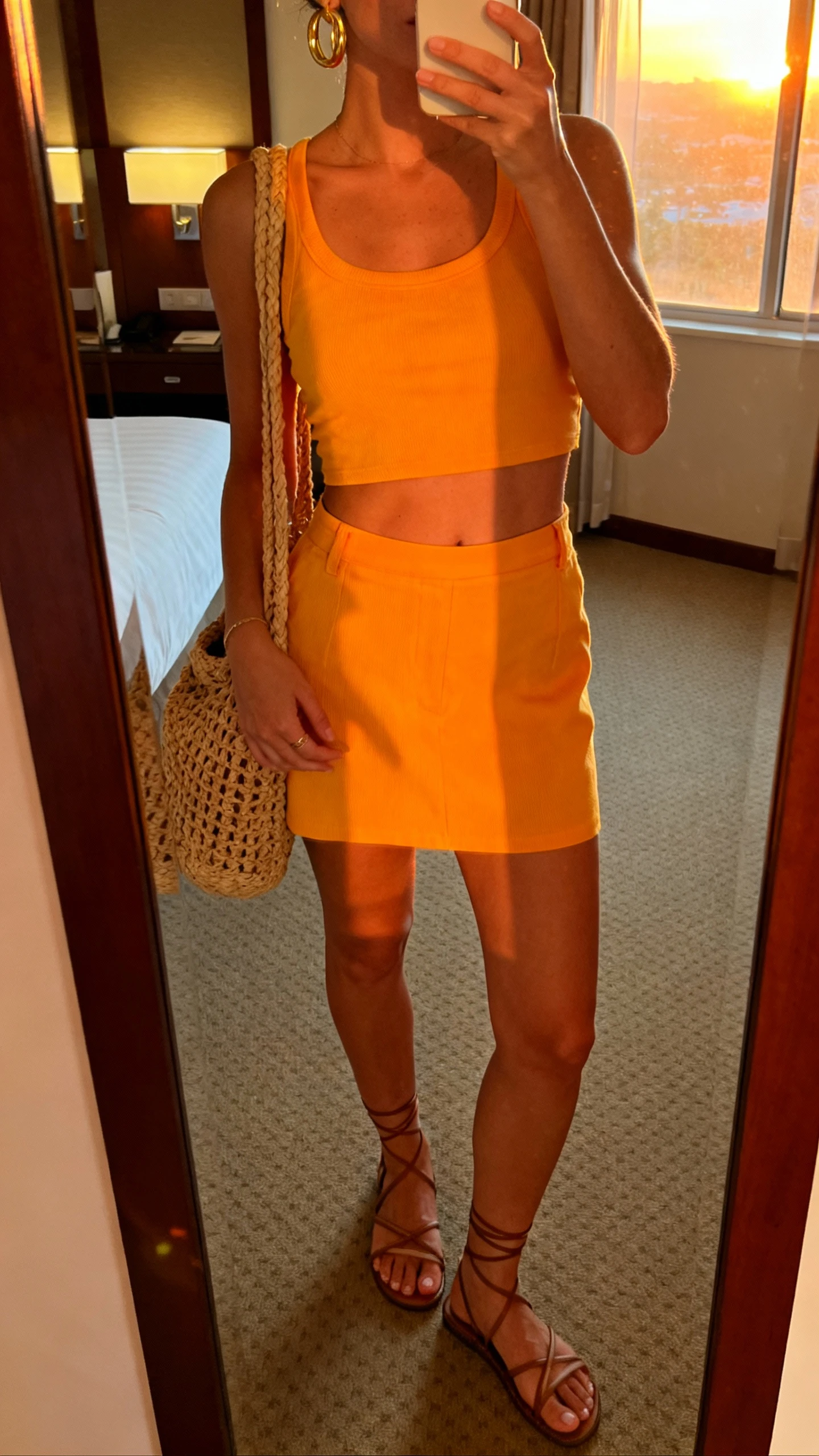 - Bold citrus co-ord set (cropped top + high-waist skirt or shorts)