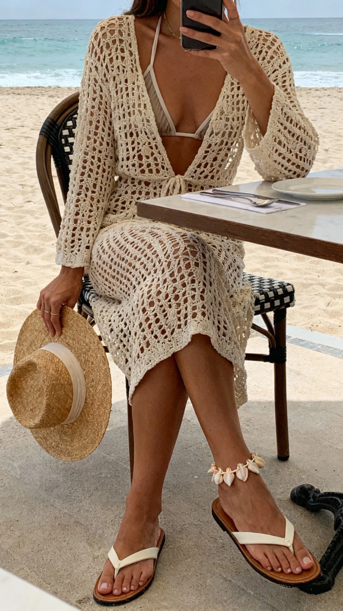 - Sheer layer adds coverage without hiding the bikini top—leave it open.