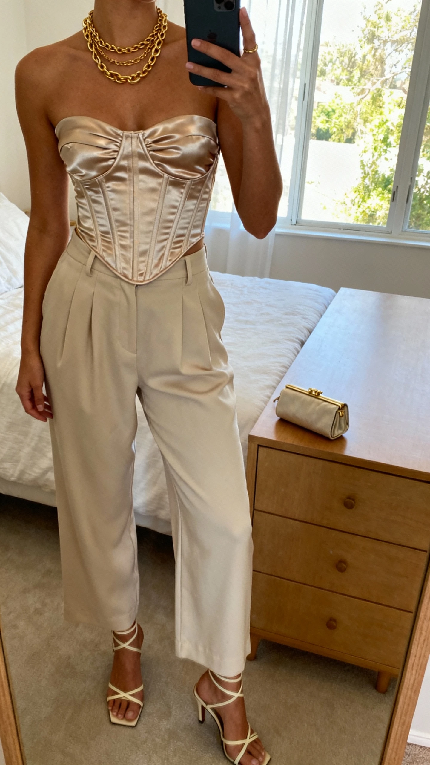 9. Satin Corset Top & Wide-Leg Trousers