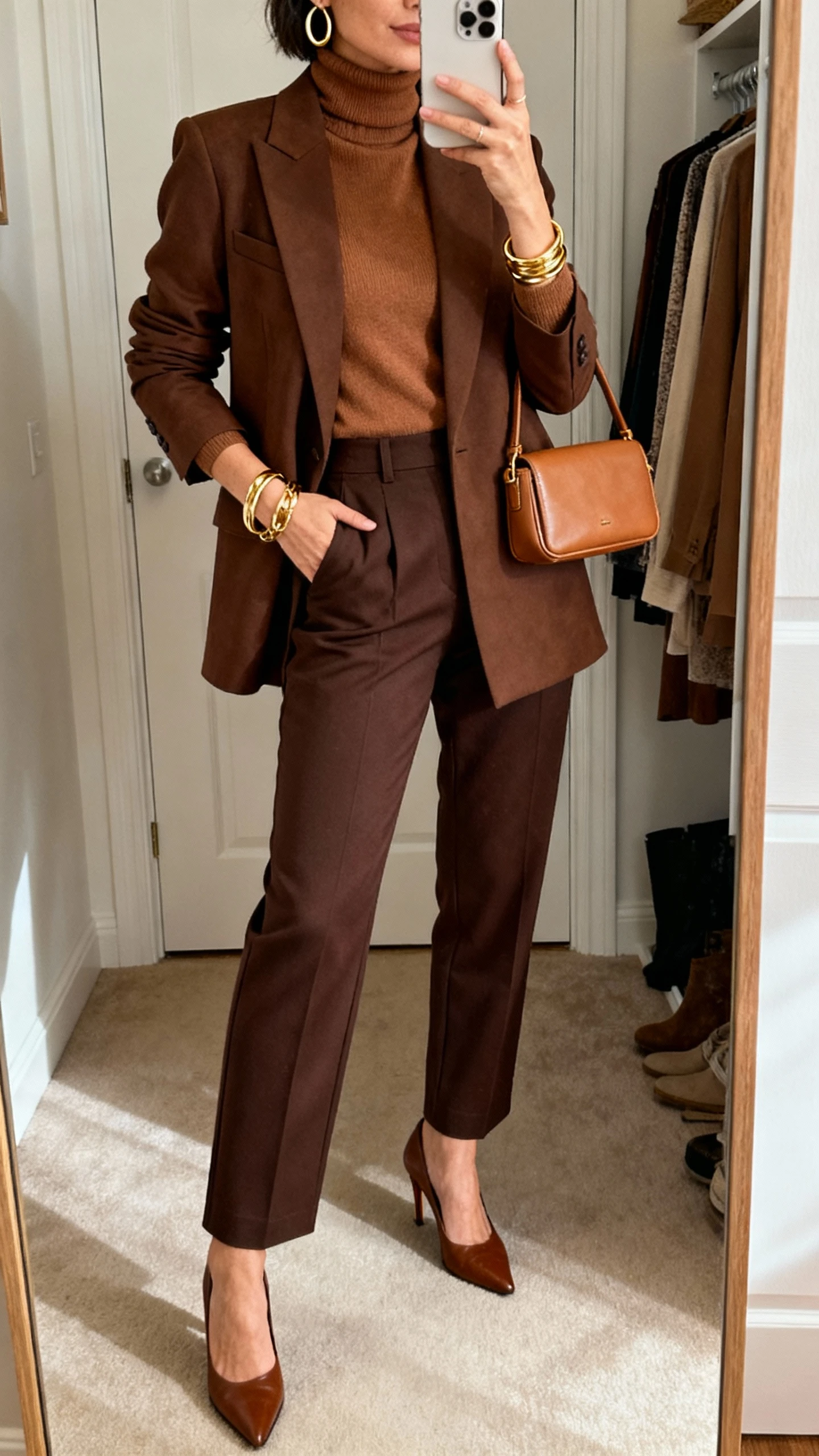 Monochrome is the shortcut to luxury. Rich chocolate and caramel tones look incredible on deeper skin—warm, glowing, and ultra-chic. This layered look is perfect for cooler temps without sacrificing style.