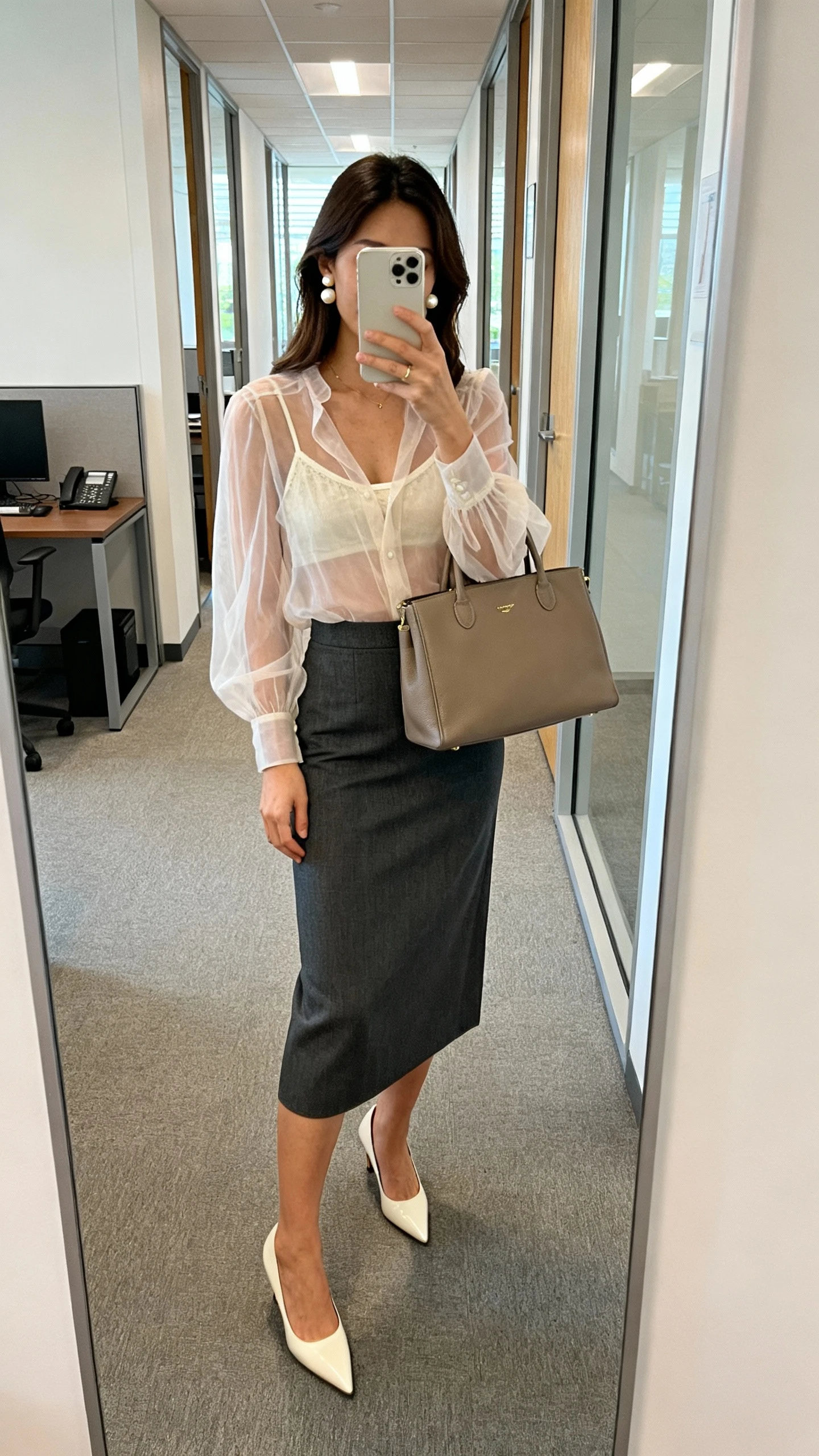 7. Romantic Sheer Blouse & Tailored Midi Skirt