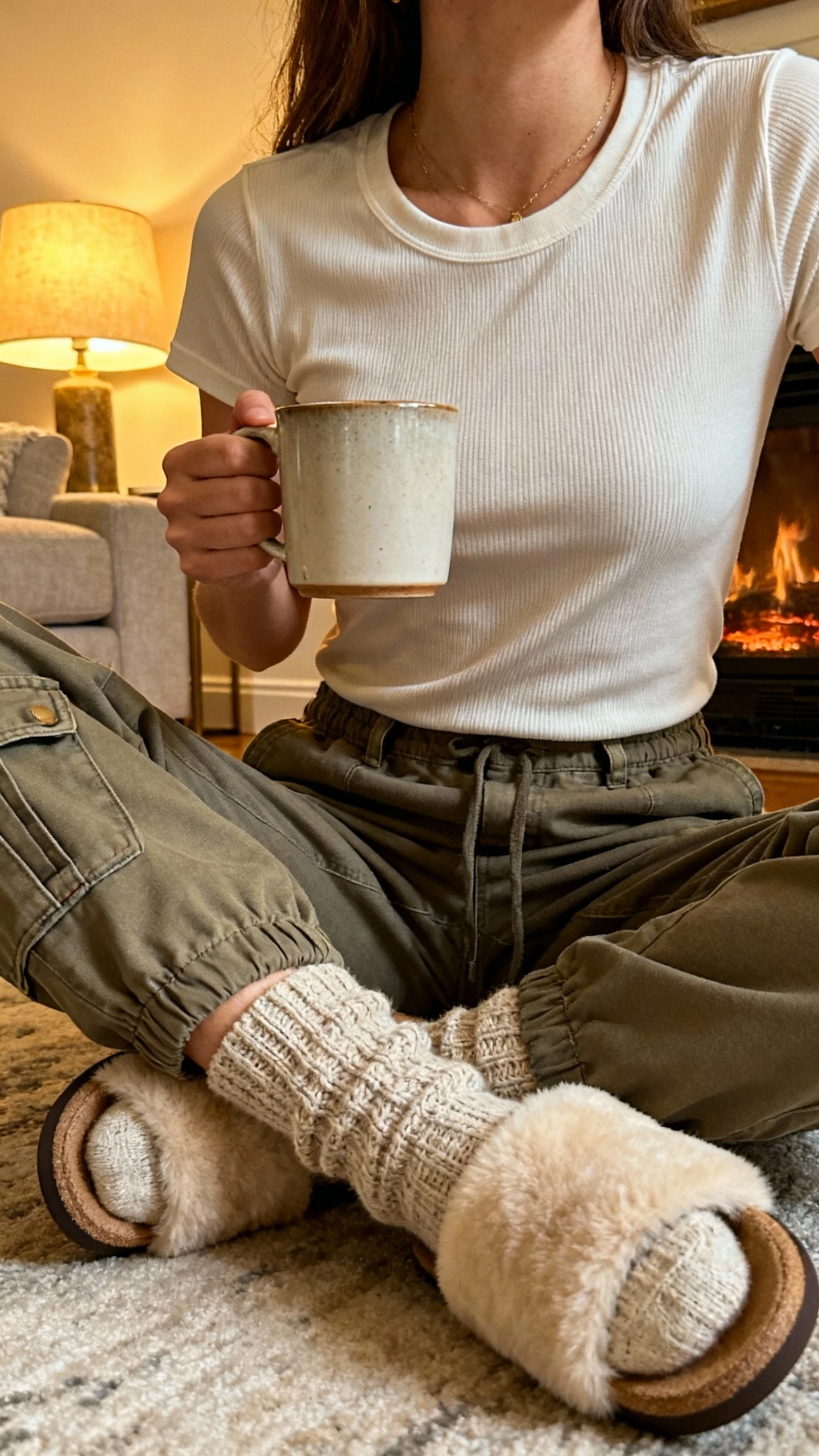 10. Cozy Beach Bonfire Look: Thermal Tee + Cargo Joggers + Shearling Slides