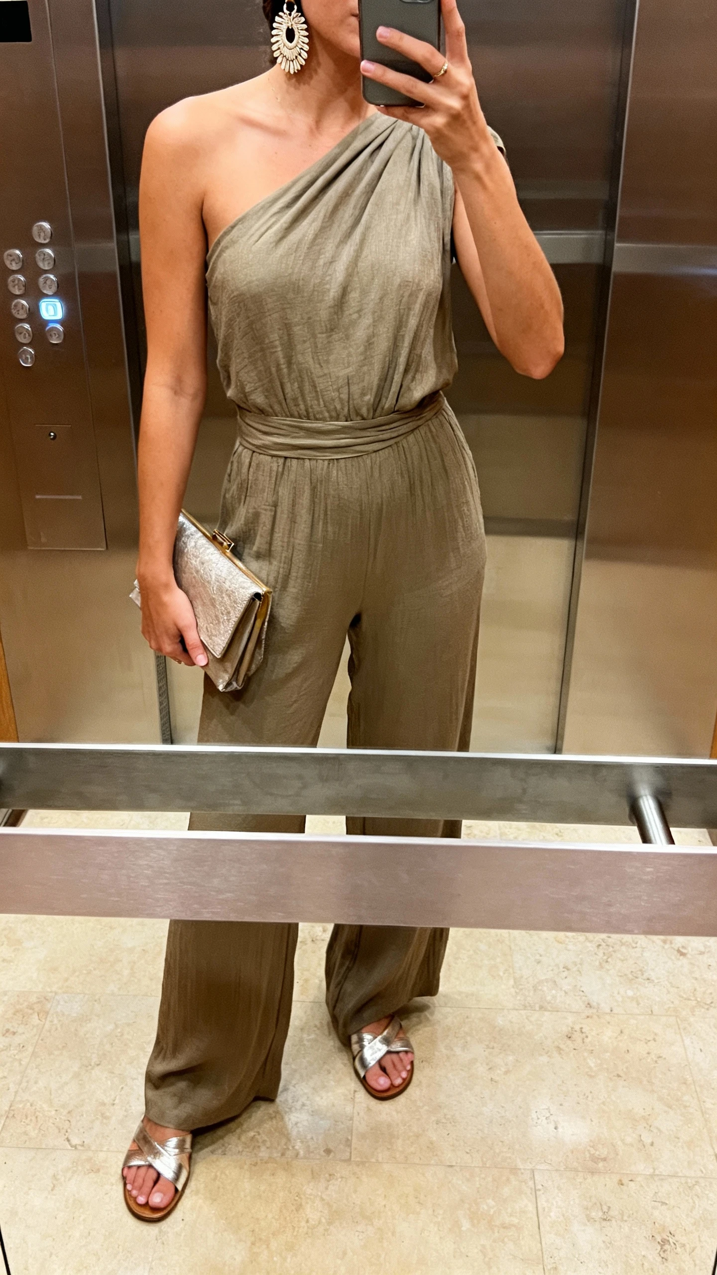 11. Resort Dinner Glam: One-Shoulder Jumpsuit + Metallic Sandals That Own The Night