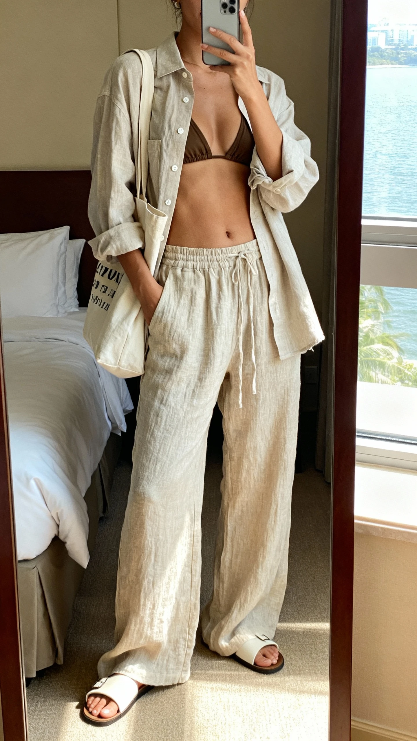 When you want to wear a bikini but also look “outfit-ready,” this is your power move. Linen pants and an oversized shirt give structure while keeping everything beachy and breathable. It’s the apex of casual-sexy.