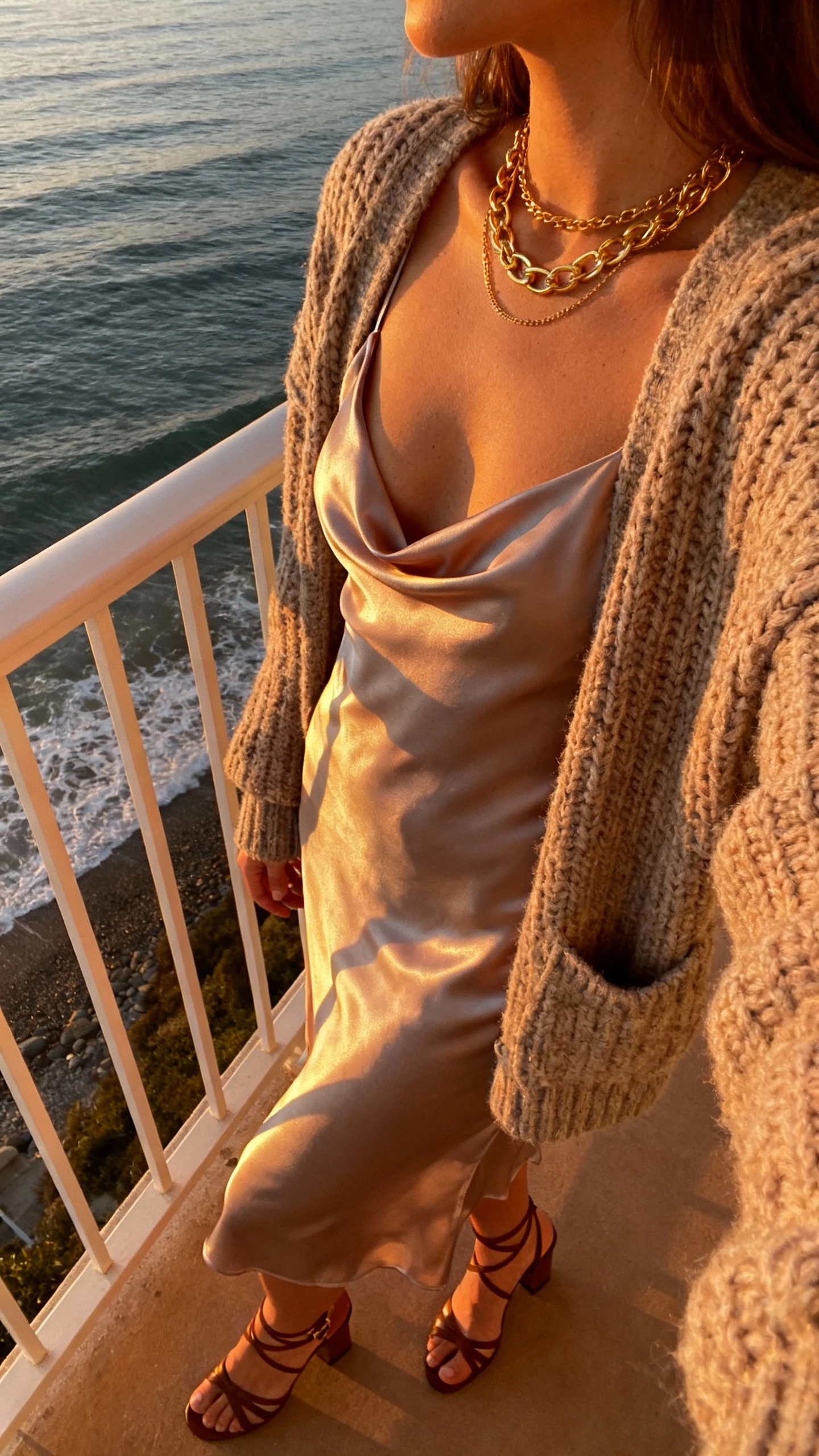 2. Silk Slip Dress + Chunky Cardigan That Turns Heads At Golden Hour