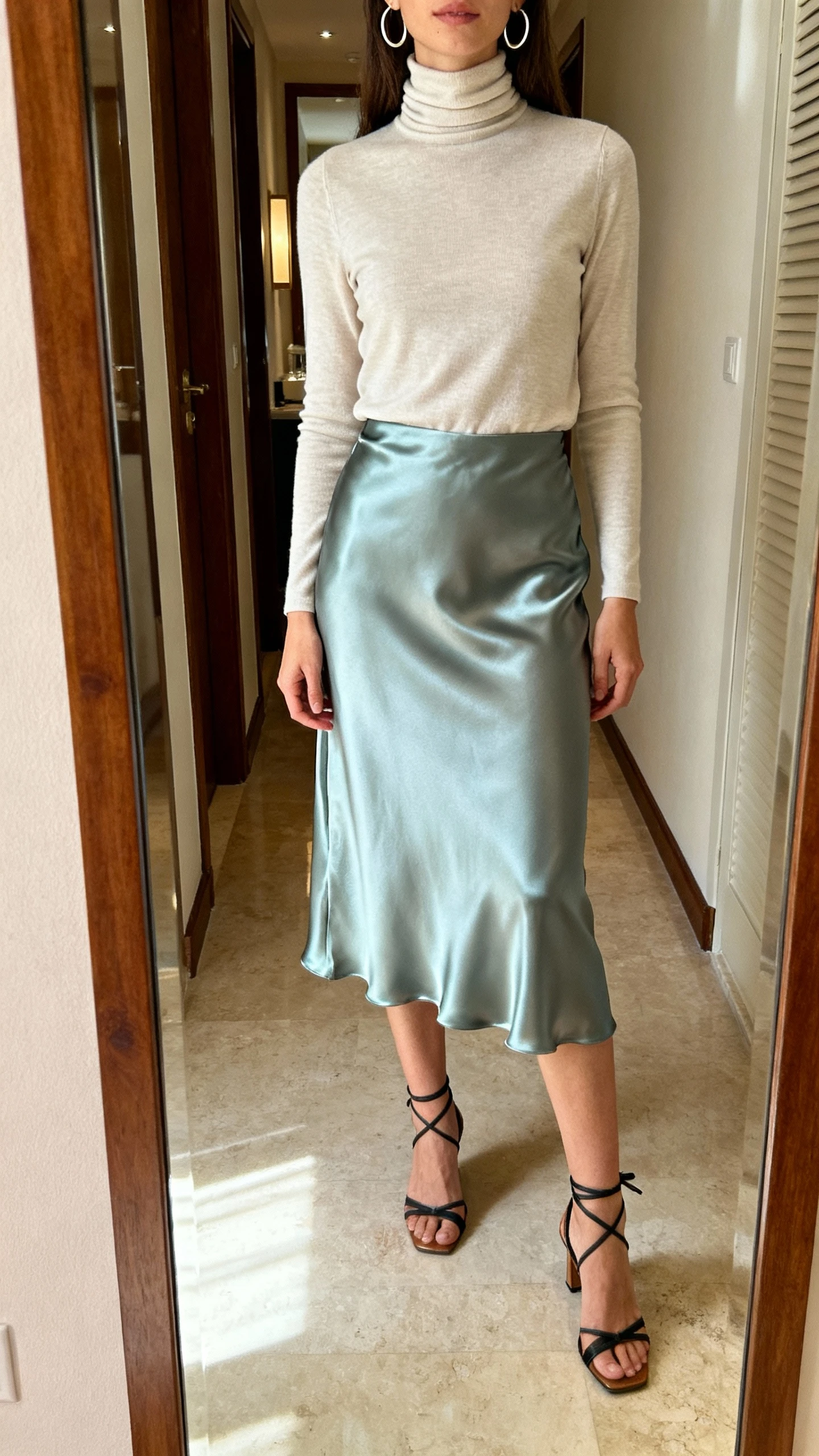 5. Satin Skirt + Lightweight Turtleneck That Looks Chic In Every Photo