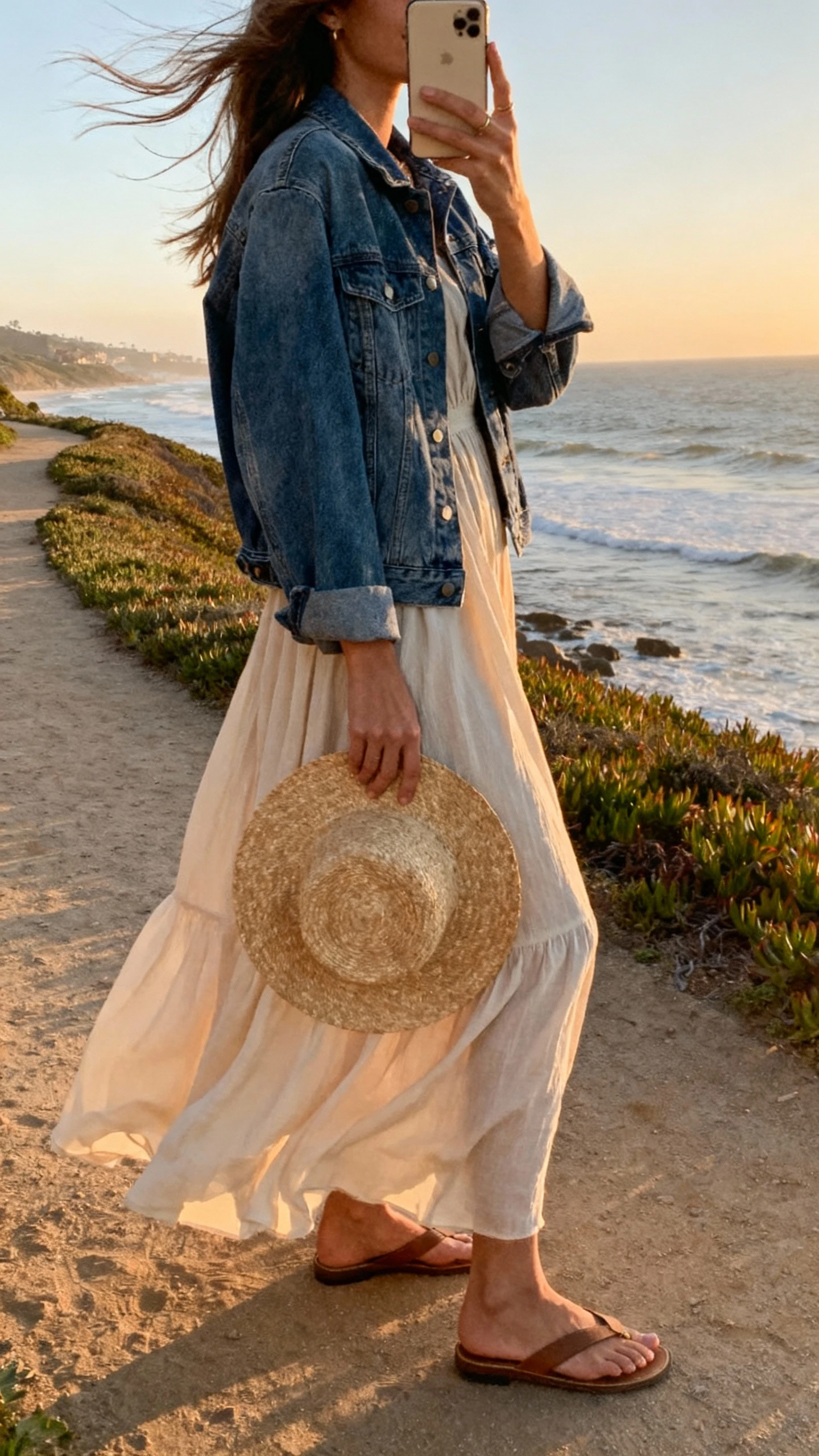 7. Flowing Maxi Dress + Denim Jacket For Romantic Walks In The Sea Breeze