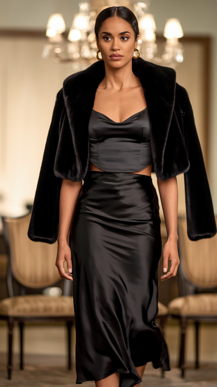 Play with textures: Mix wool, satin, leather, and knitwear to keep things visually interesting.