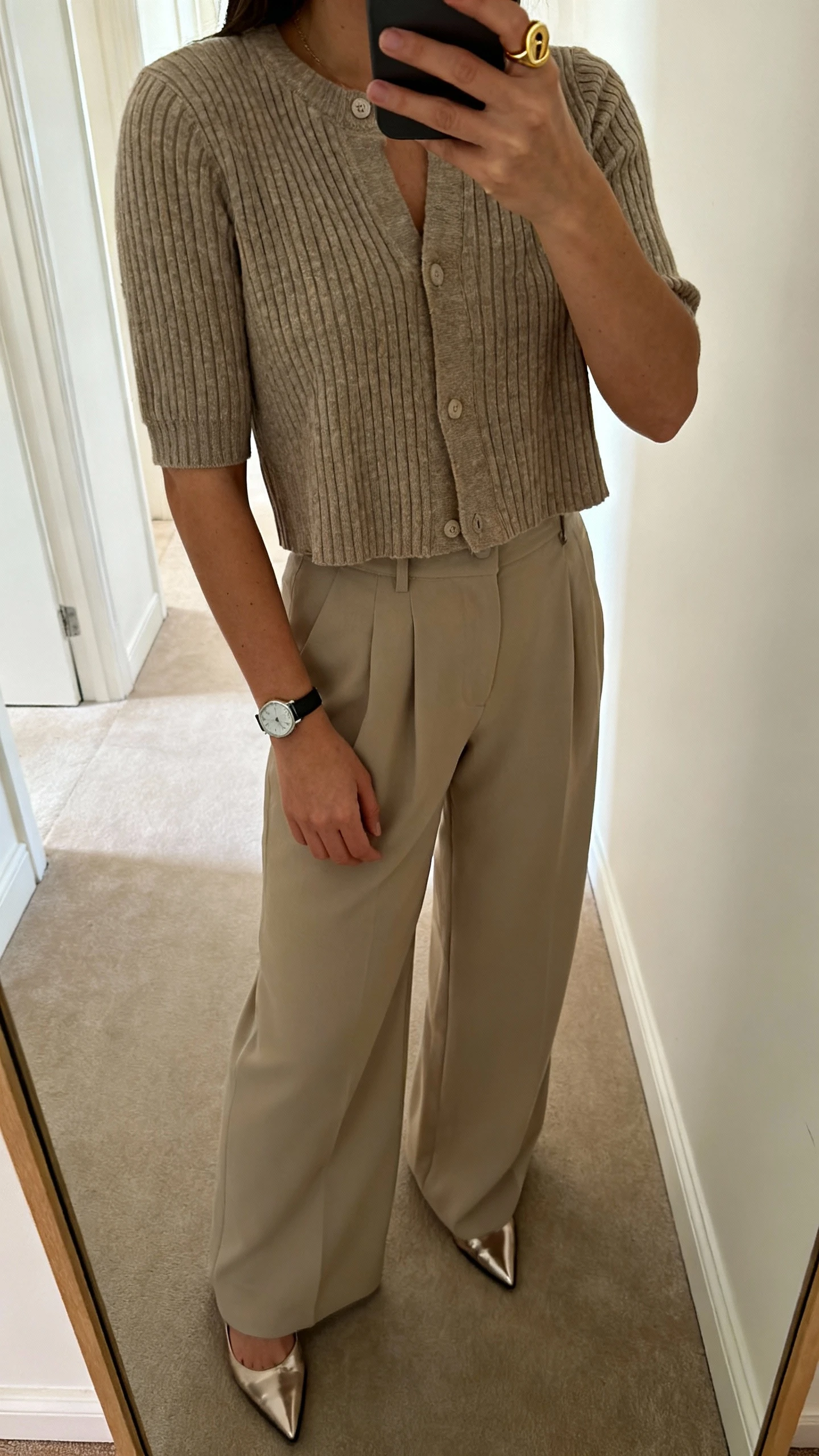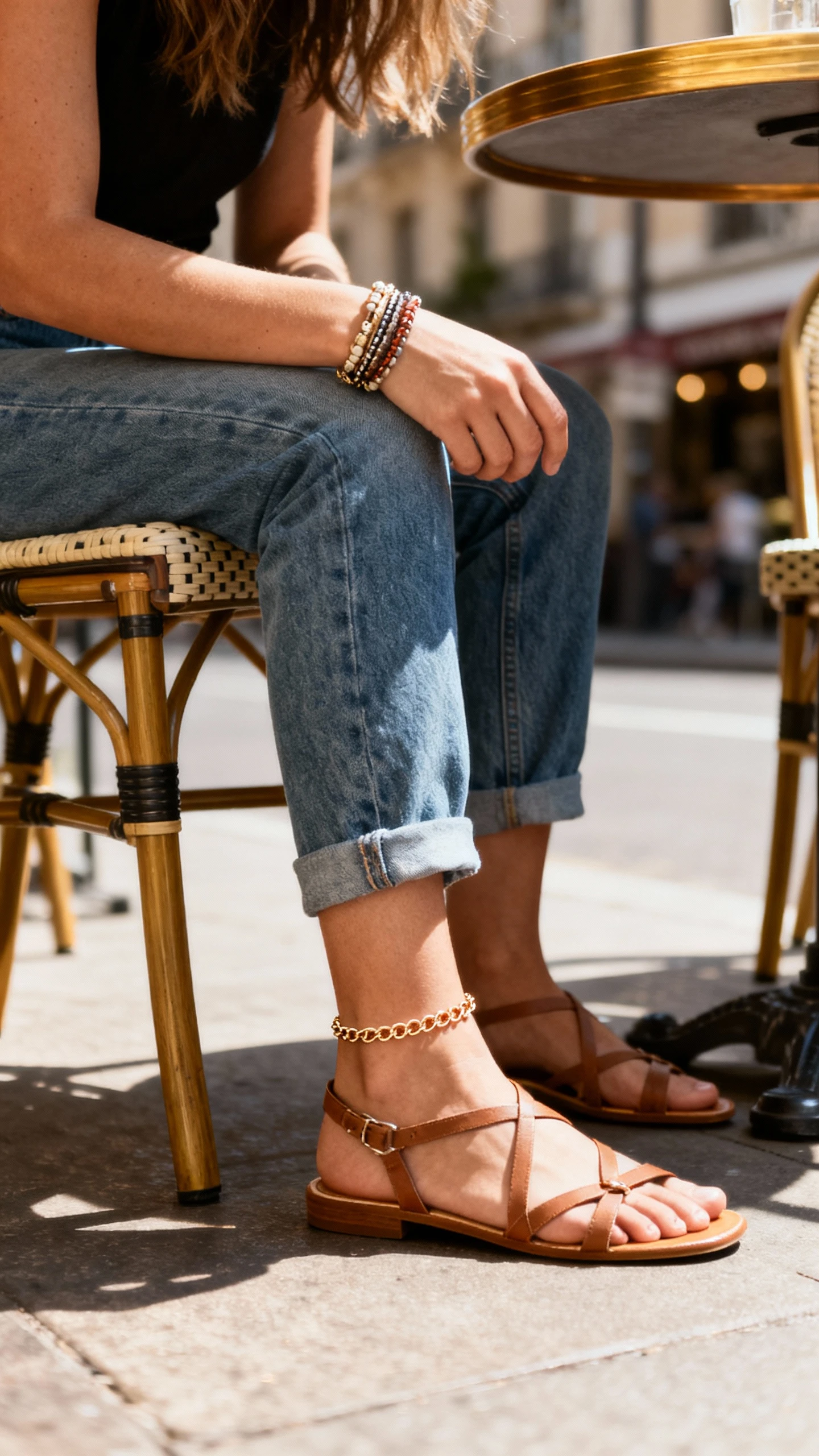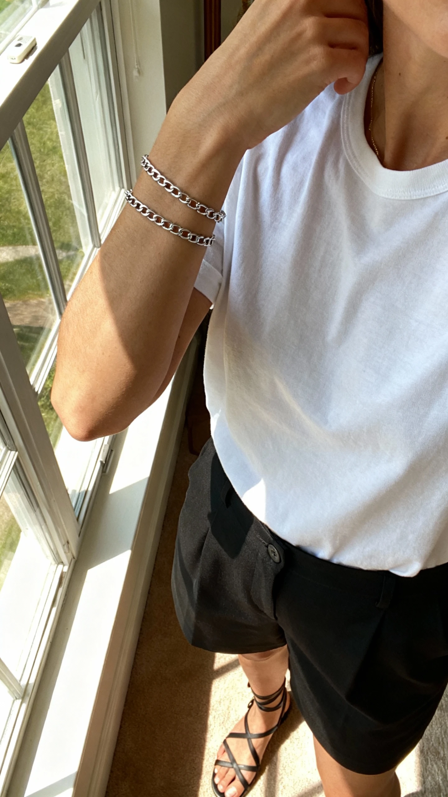 - Optional: watch and delicate chain bracelet for stacking