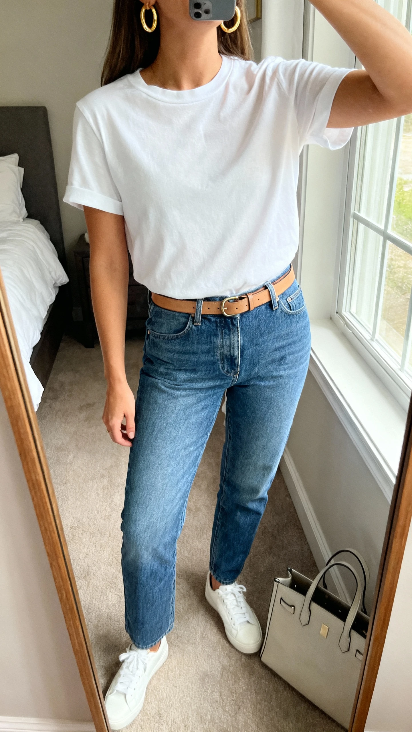 - Optional: slim leather belt and structured tote