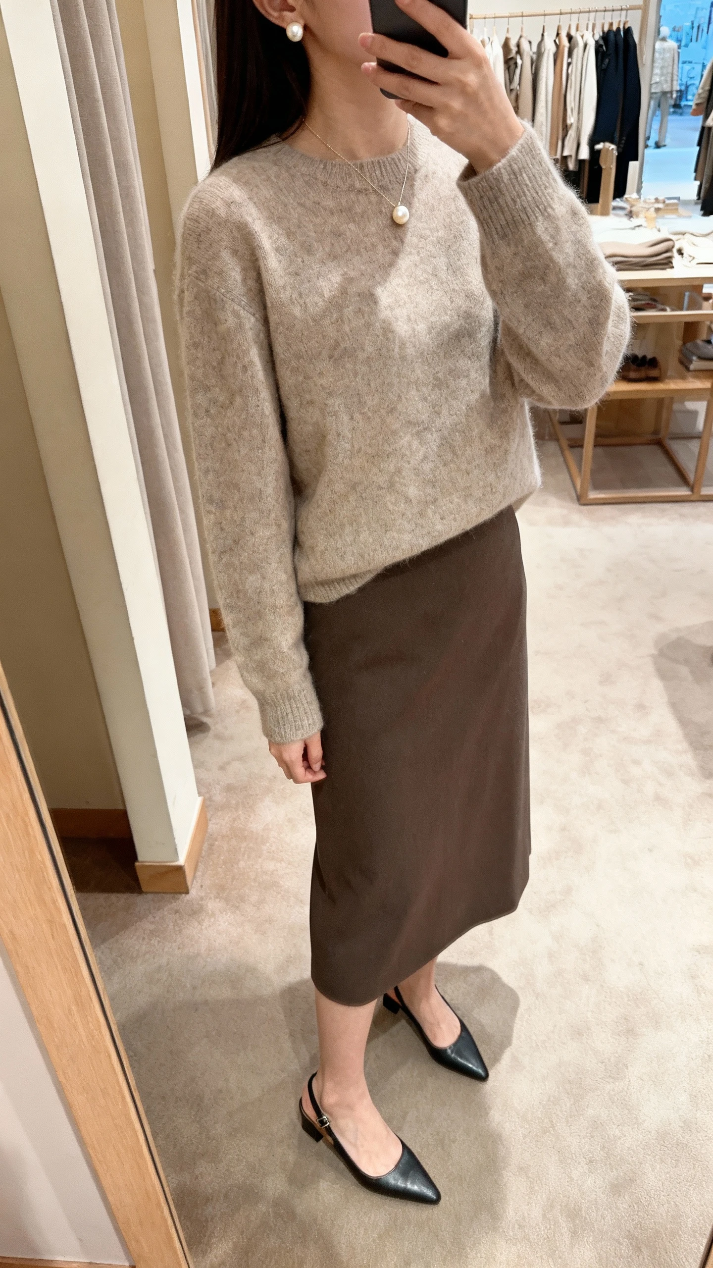 - Straight-leg jeans or midi skirt