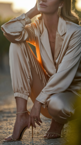 Yes, heels with sweatpants—trust me. A silky satin blouse tucked into tailored joggers creates a fun contrast between casual and glam. Add strappy heels and statement earrings, and you’re cocktail-hour ready.