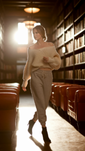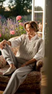This outfit gives academia-meets-athleisure energy. Layer a white button-down under a chunky knit vest and pair with soft sweatpants. Add loafers or platform sneakers, and you’ll look like you just stepped out of a Pinterest mood board.