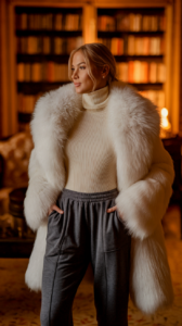 Want to look like you tried, even when you didn’t? A fitted turtleneck tucked into high-quality sweatpants, topped with a bold statement coat (like leopard print or faux fur), is your answer.
