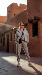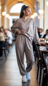 There’s just something about a matching sweat set that makes it feel intentional—like you planned your cozy day. Pair a cream or taupe set with chunky gold hoops, a slick ponytail, and crisp white sneakers for an easy elevated vibe.