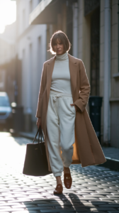 This is old money meets comfort. A long wool coat in camel or charcoal instantly takes sweatpants from couch to classy. Pair it with sleek loafers and a turtleneck for an outfit that could easily belong in a Vogue street-style gallery.