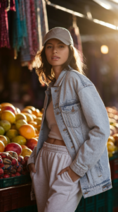 This one’s classic and casual. Throw on a light wash denim jacket over your sweatpants and tee combo, then top it off with a baseball cap for that easy weekend vibe.