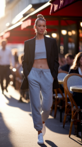 This combo screams model-off-duty. A structured blazer instantly elevates your gray sweatpants, making you look put-together even if you’re wearing your favorite sports bra underneath.