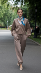 This one’s for the girls who love their feminine touch. Soft knit cardigans paired with slim-fit sweatpants and delicate ballet flats create that “quiet luxury meets French café” vibe.