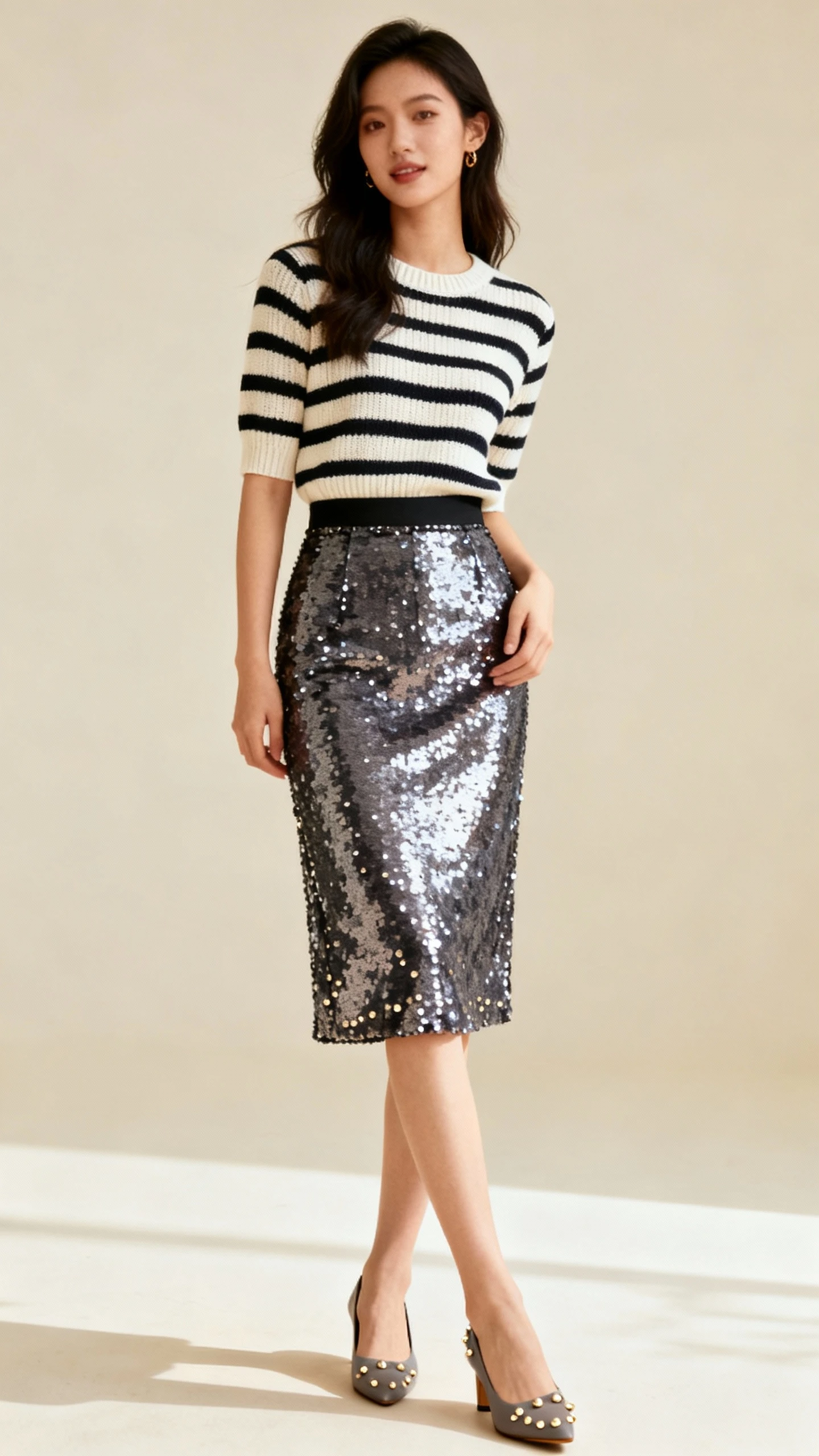 7. Striped Knit + Sequin Skirt That Balances Casual And Shine