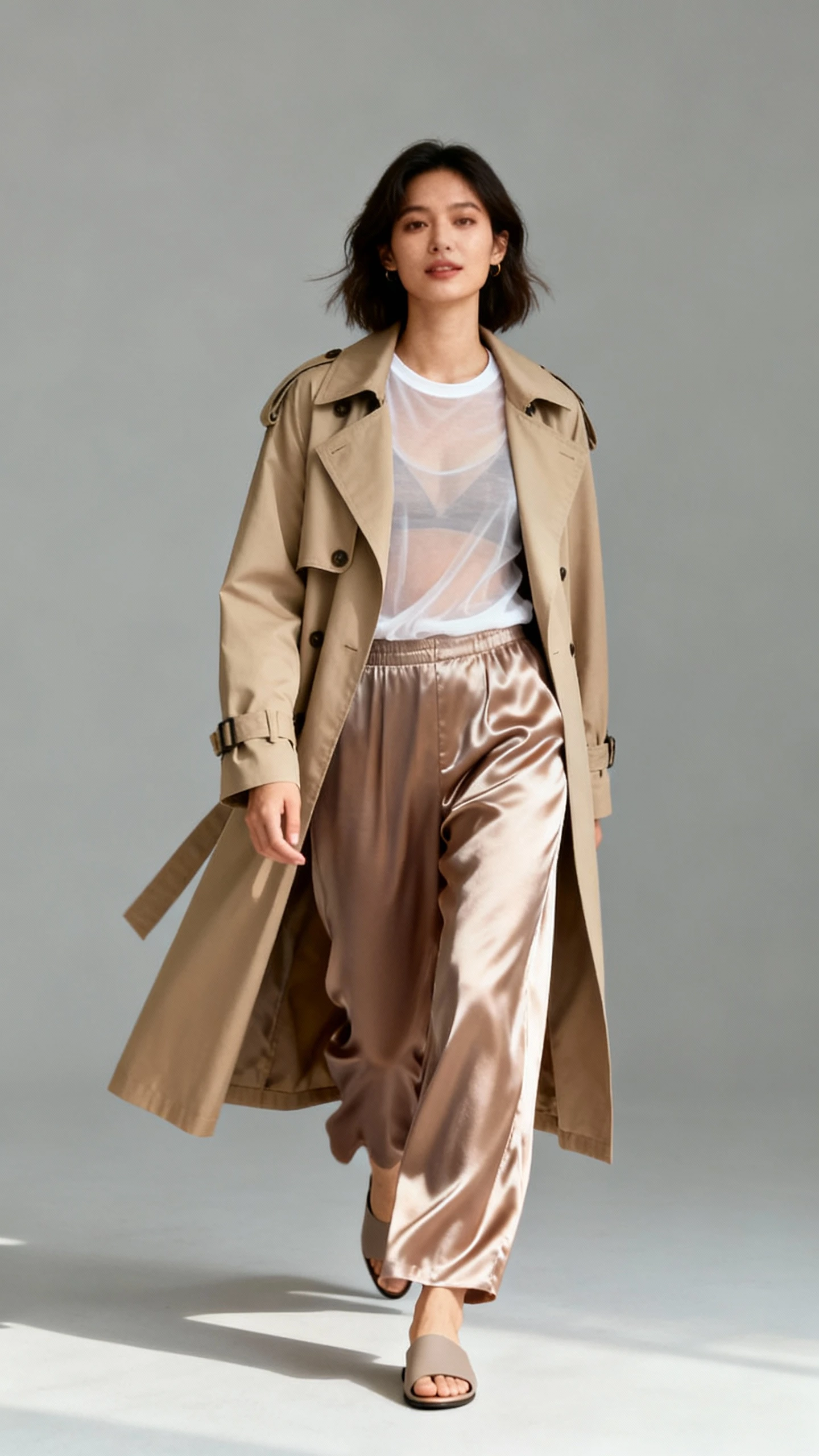 8. Trench + Sheer Tee + Satin Pants That Whisper Cool