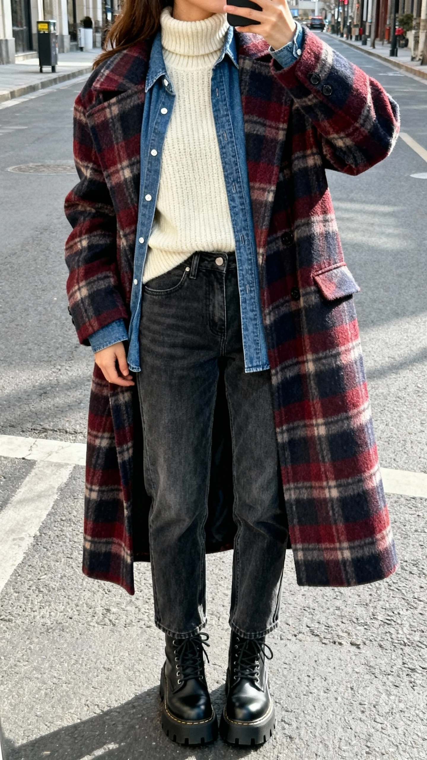Canadian tuxedo, but make it winter. Layer double denim with a warm knit and top it off with a bold statement coat—think plaid, shearling-lined, or something with a strong color. It’s relaxed yet standout, and it low-key goes with everything.