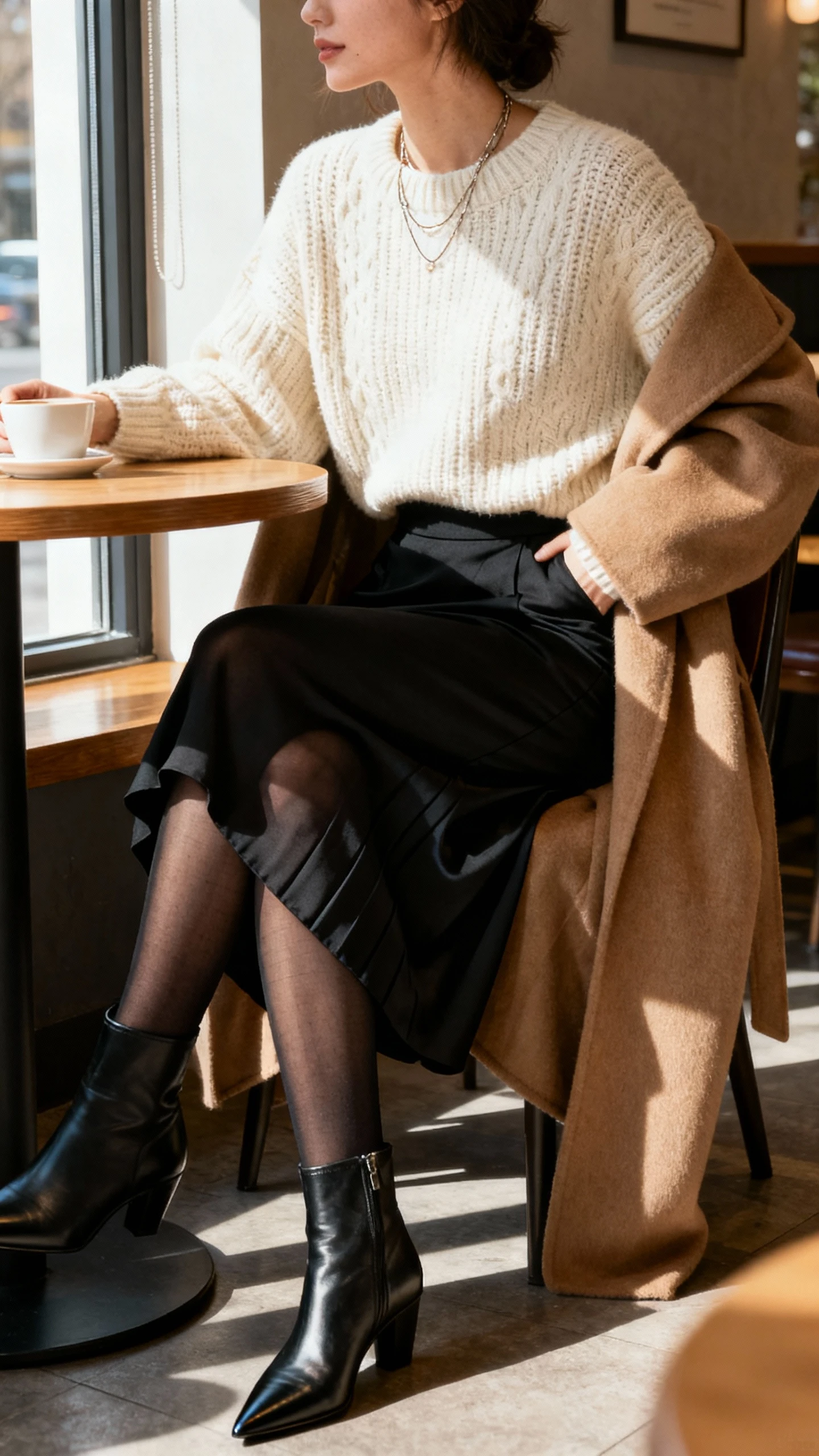 Wear this to casual dinners, galleries, or weekend plans where you want something cool but comfortable. Swap jeans for a denim midi skirt with tights if you want a dressier, editorial vibe. And if it’s extra cold, layer a thin down vest under the coat—no one will know, and you’ll be toasty.