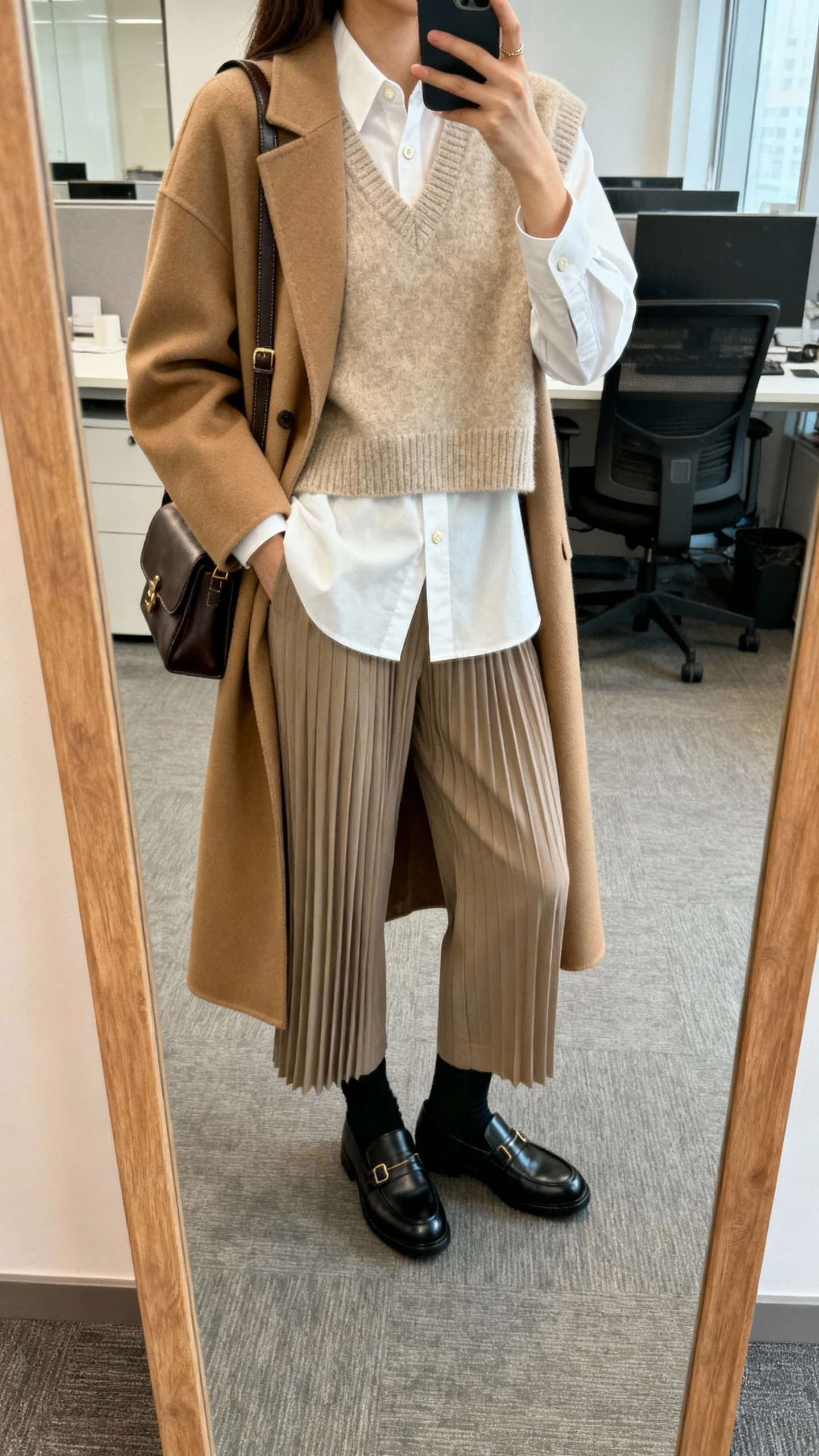 This look leans preppy without feeling stiff. A crisp button-down, a knit vest, and a long coat give that quiet-luxury energy that’s smart, cozy, and totally wearable. It’s tailored enough for work but relaxed enough for weekend plans.