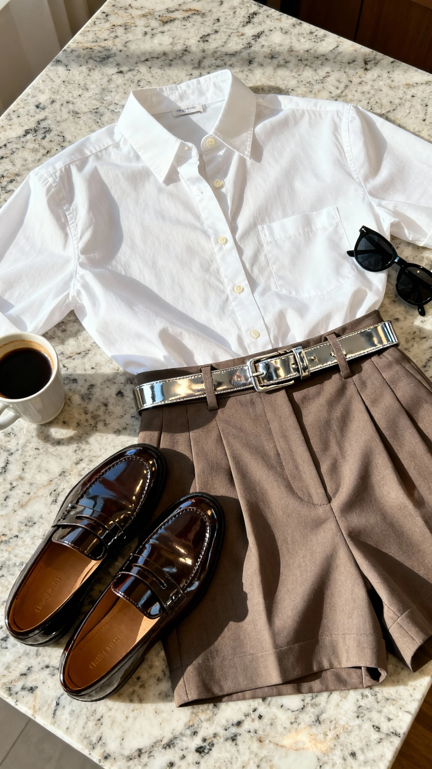 2. White Shirt + Tailored Shorts With High-Shine Accents