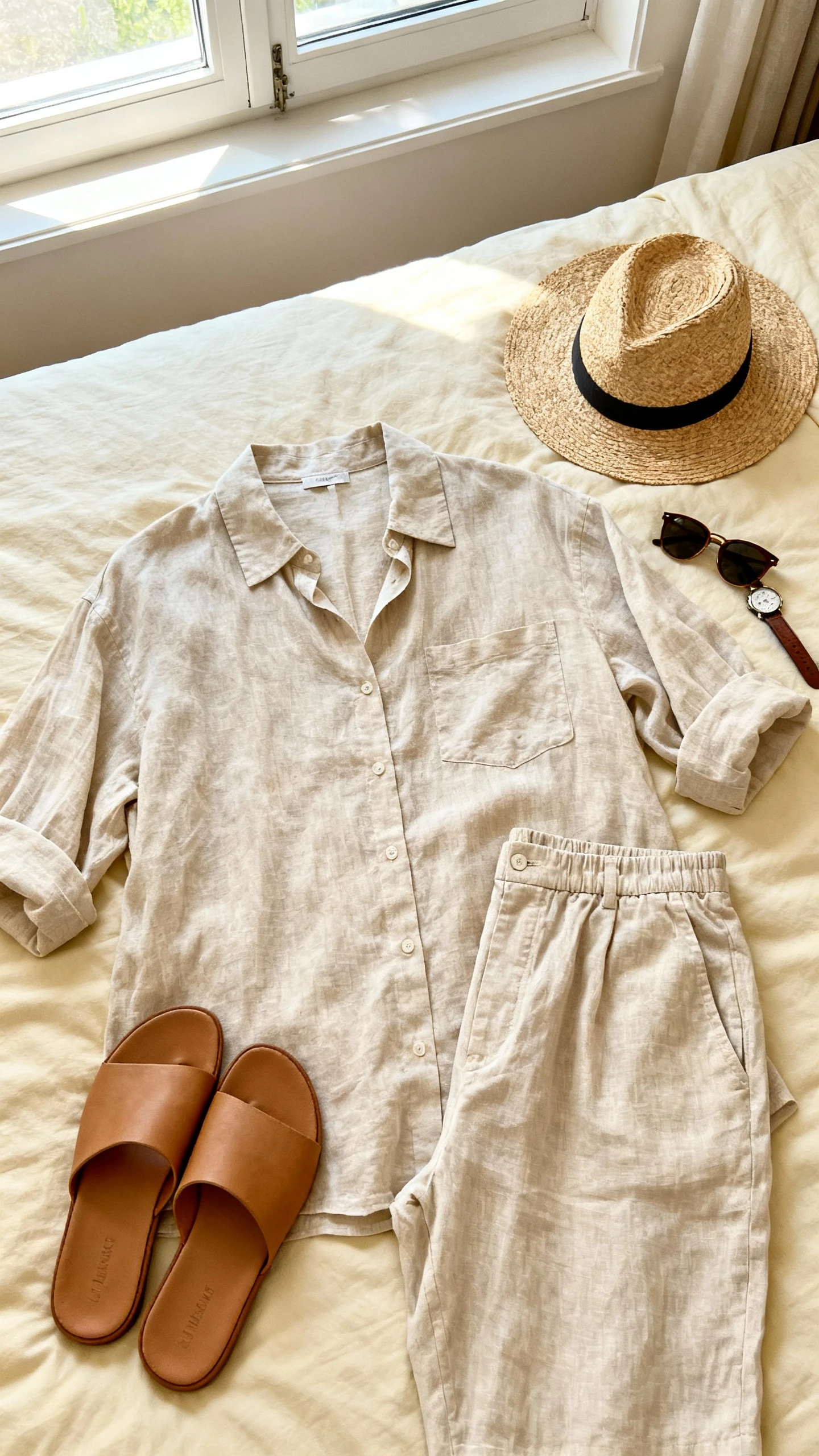 - Linen shirt + wide-leg linen trousers or linen vest + trousers in cream, oat, or pale stone