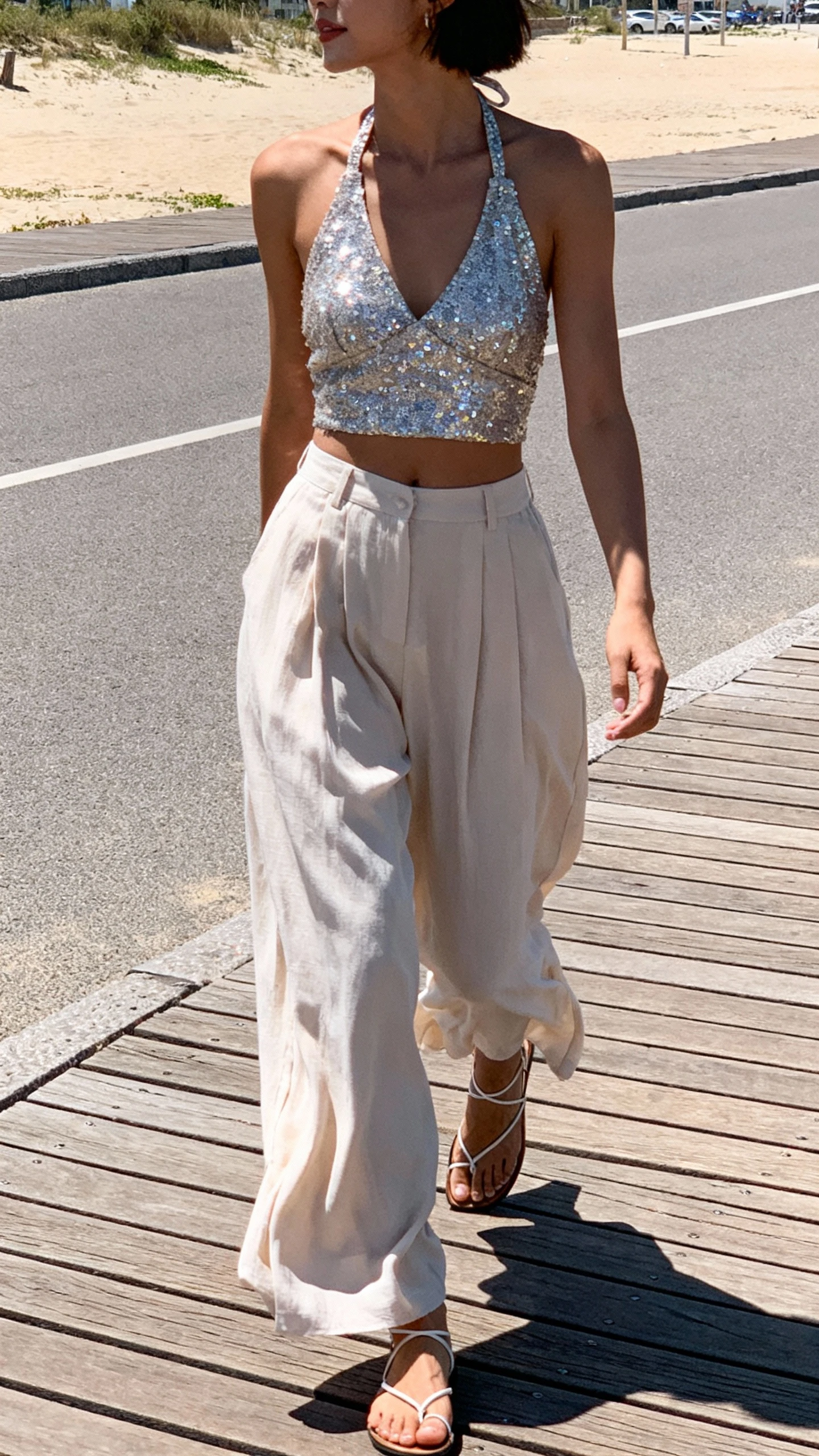 3. Breezy Wide-Leg Pants + Sparkly Halter For Effortless Cool